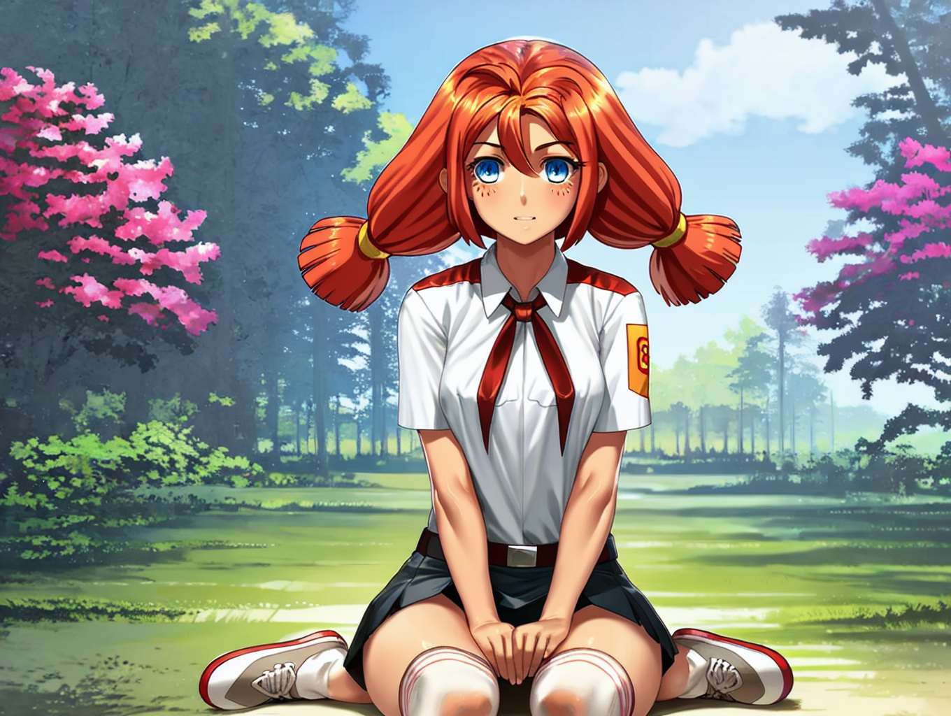 강화 태그: human,orange eyes,orange hair,a red pioneer tie,pioneer form,t-shirt,skirt