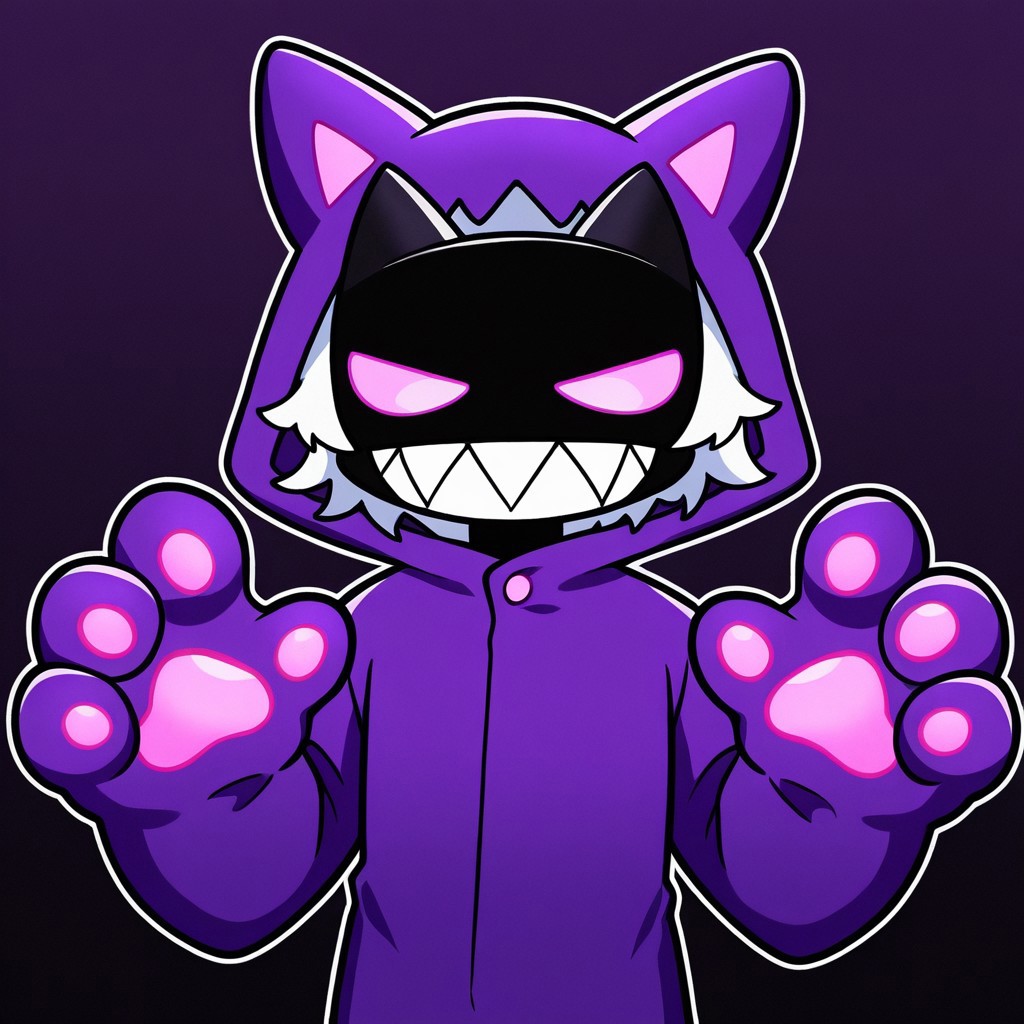 Solo, male, purple kigurumi full fursuit, animal ear hoodie, pawspad, purple hands, purple paws black smiling cat mask covered face, sharp teeth, black mouth mask, pink sclera,without pupils,no nose,white hair, tan body