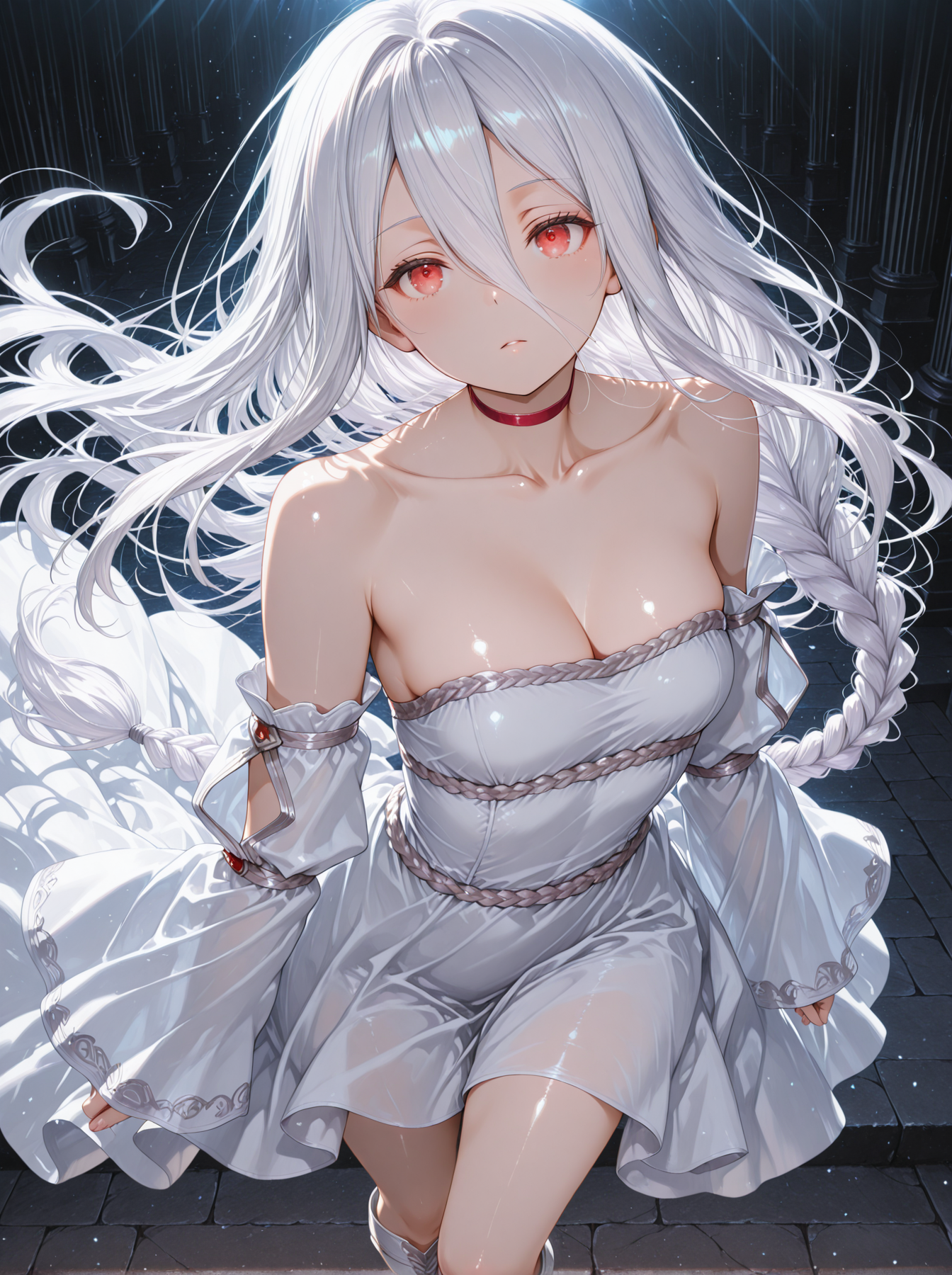 衣装:(赤い首輪、白いストラップレスドレス、裸の肩、鎖骨、胸元、白い膝上ブーツ)