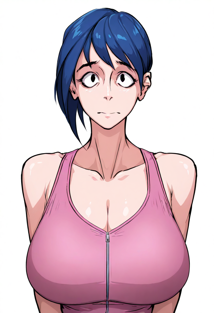 Marina のプロンプト: 1girl, marina, short hair, black eyes, blue hair, navel, cleavage, mature female, grey pants, midriff, huge breasts, bare shoulders, collarbone, pink tank top, yoga pants