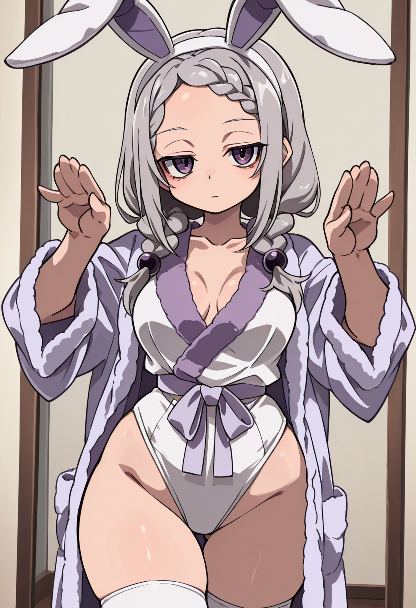 two-toned purple bathrobe, white thigh-highs,