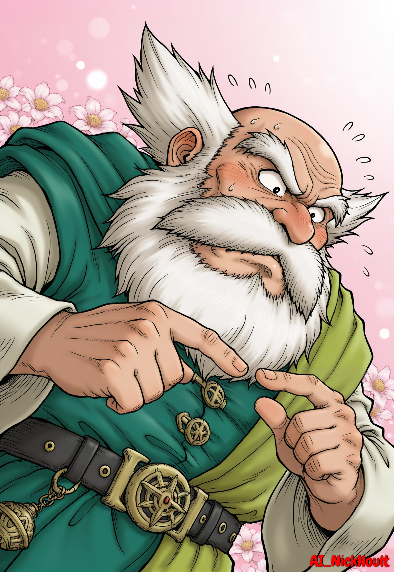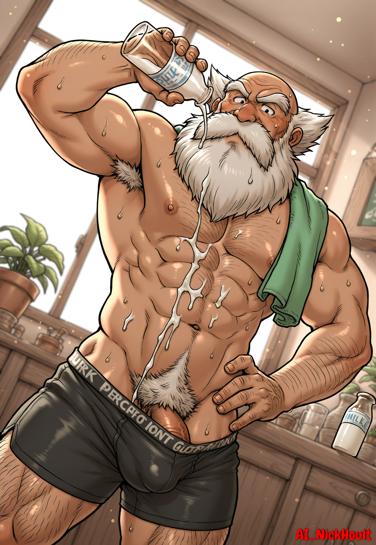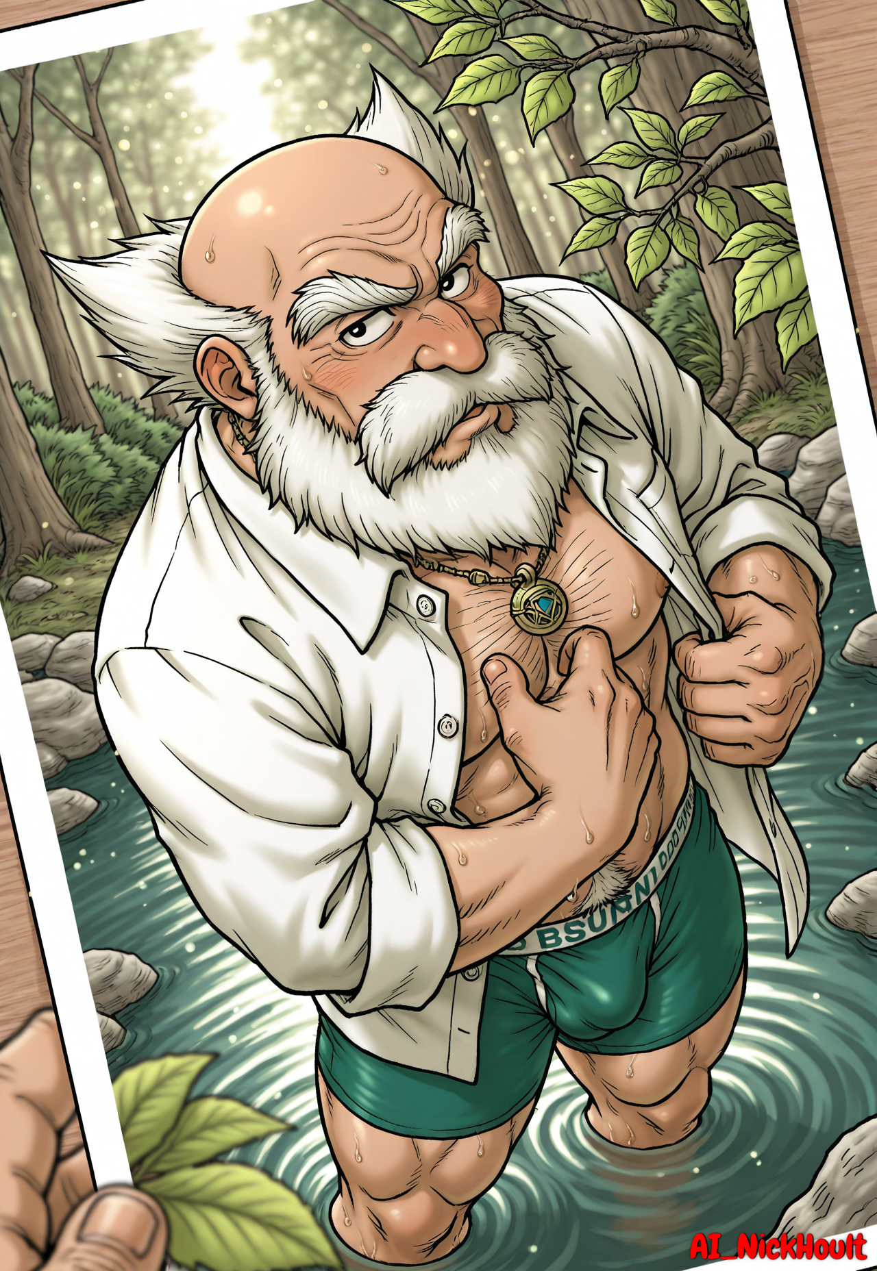 Borya, old man, bald head, short white hair, large bushy mustache, bushy eyebrows, long bushy beard, black eyes,
