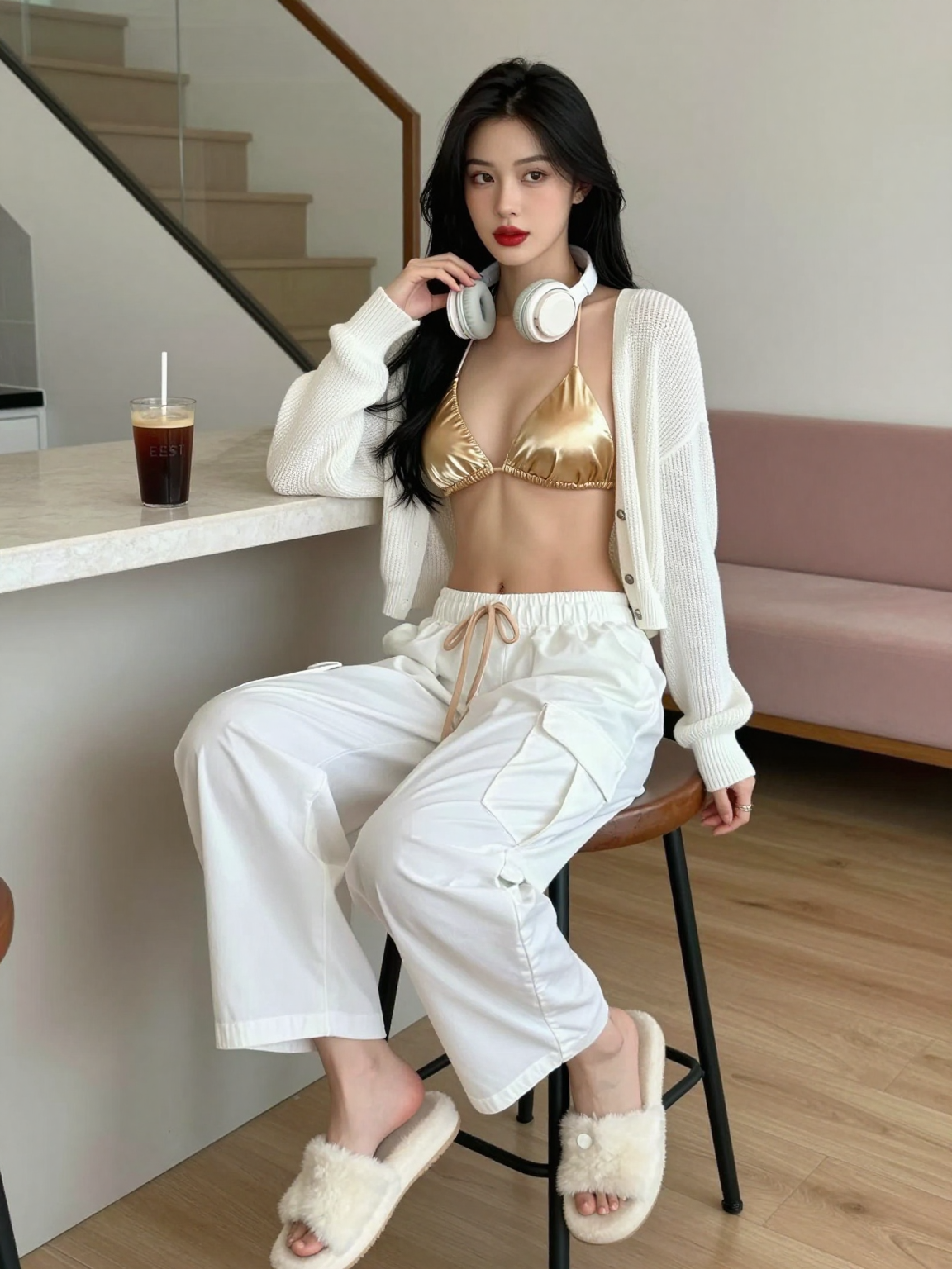 A black-haired woman with smooth, shoulder-length hair that falls naturally. Her facial features are well-defined with a straight nose, rosy lips, and a soft chin line. She has a slim and slender figure with a flat abdomen, full and rounded bust with noticeable curves. She is dressed in a modern casual eclectic style—wearing an oversized white knit cardigan over a champagne-colored metallic triangle bikini top that reveals her collarbones and arm lines. On the bottom, she wears a pair of loose-fit white cargo wide-leg pants, featuring a light brown braided drawstring tie at the waist with a knot accent on the side, and the pants stack naturally at the ankles. On her feet, she wears white velvet flat mule slippers with a ruffled trim detail at the opening. Around her neck, she has a beige wireless Bluetooth headset.