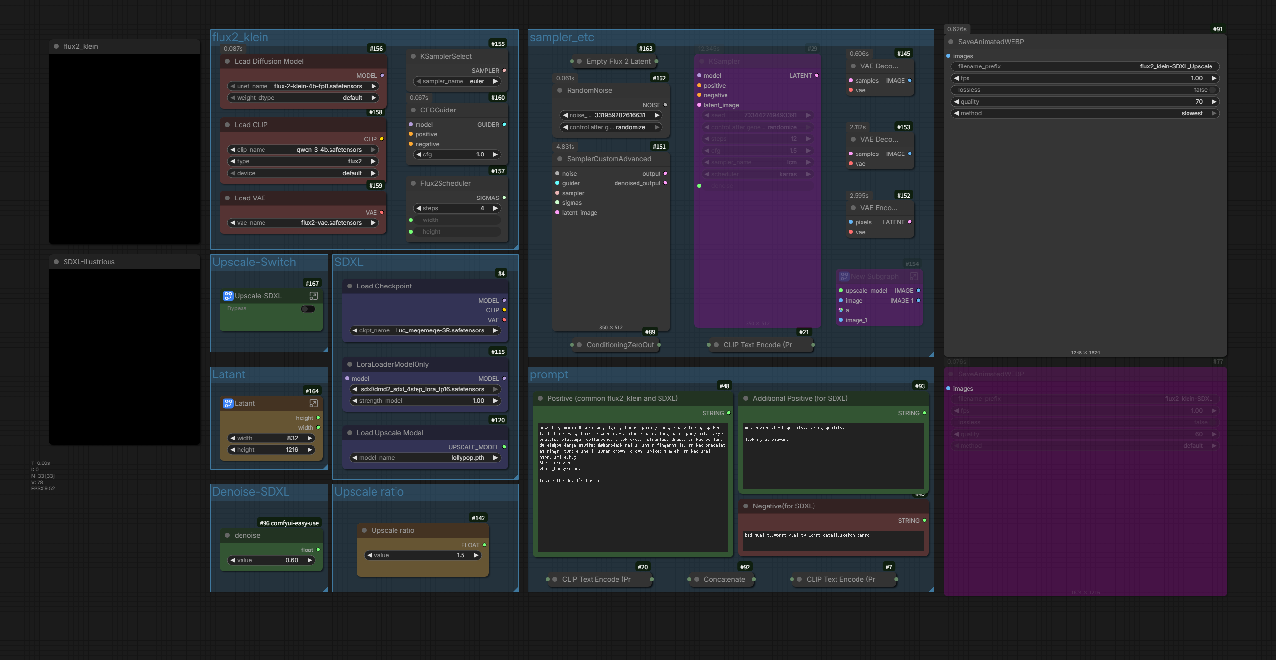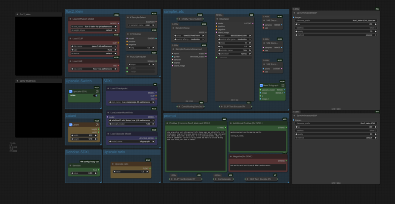 이 워크플로우의 목적은 flux2_klein의 뛰어난 프롬프트 추적 및 고화질 이미지 품질과, illustrious-SDXL의 방대한 AGC 캐릭터 자원을 결합하는 것입니다.