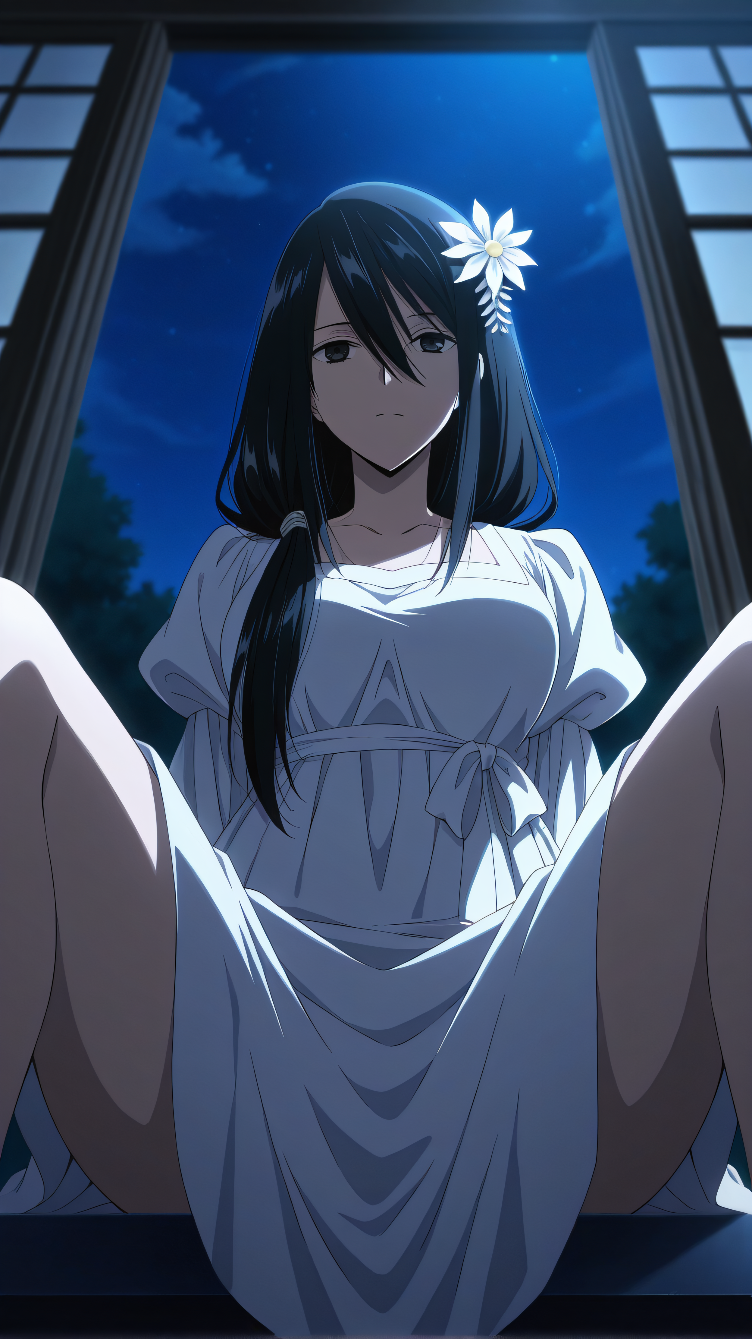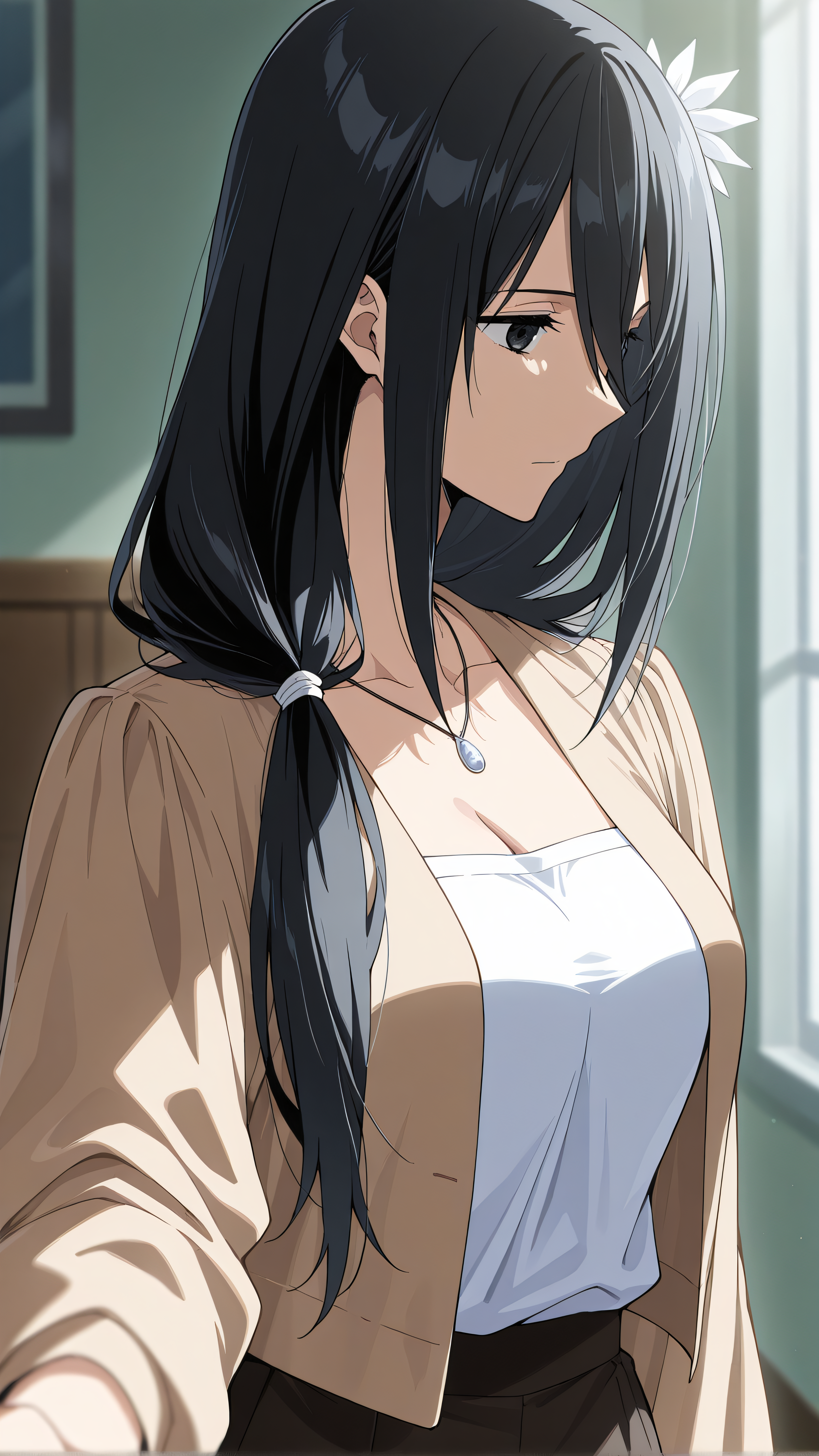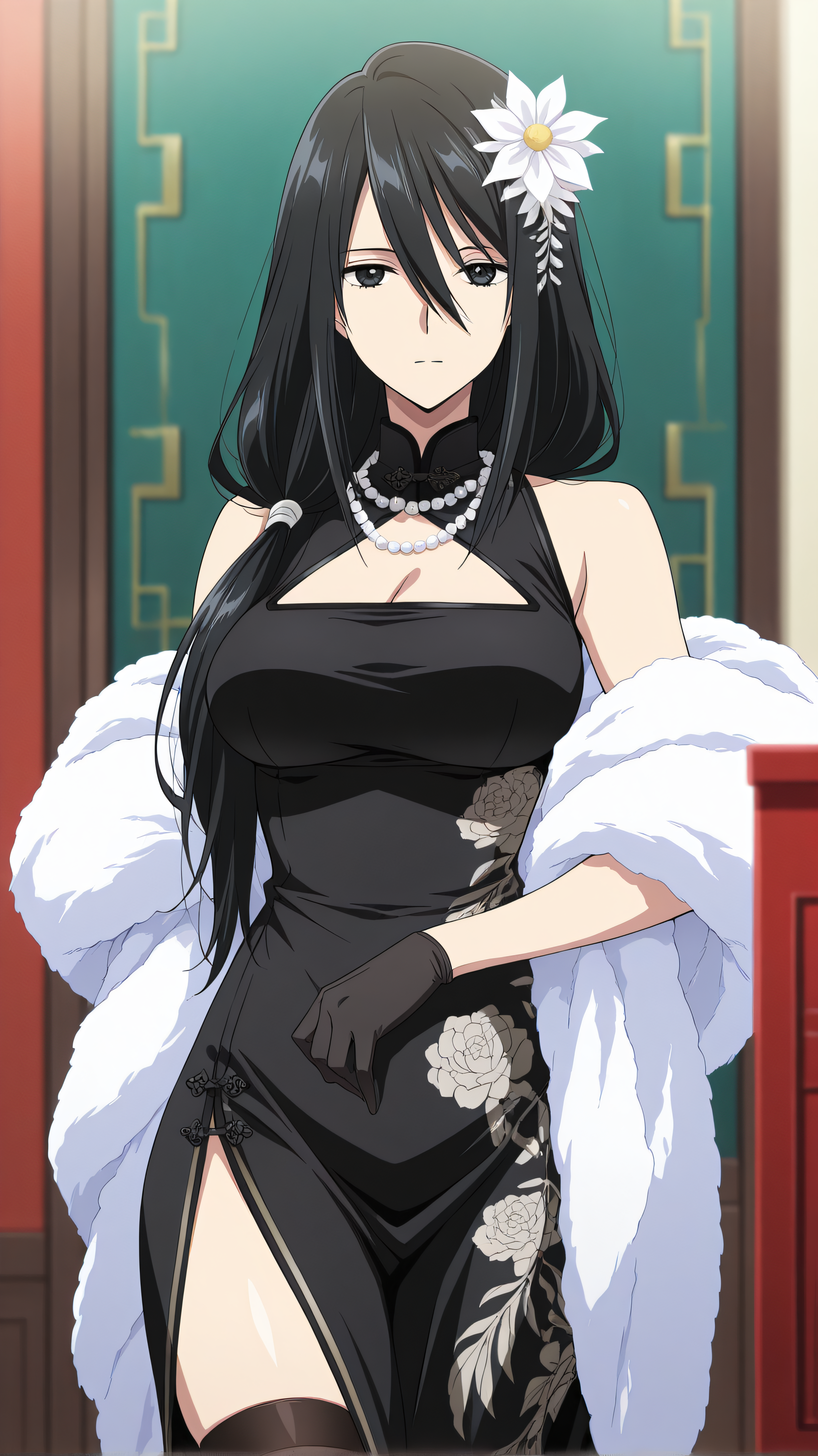 claire, long hair, hair flower, hair between eyes, hair over shoulder,black_hair, black eyes,
