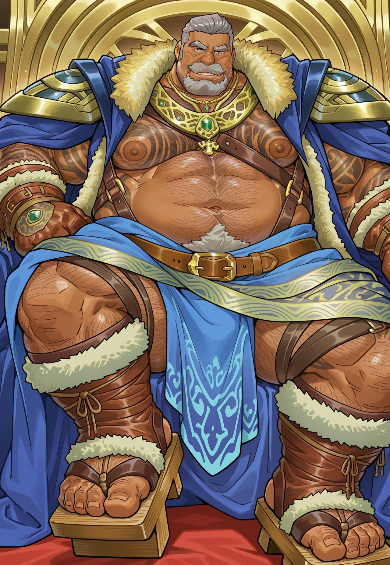 bare chest, royal blue cloak, white fur-lined collar, golden pauldrons, brown leather cross-body harness, gold necklace with green gemstone, brown leather gloves with fur trim, golden crest on glove, blue and purple layered sarong, wave-patterned fabric, scrollwork embroidery, brown leather belt, leather leg wraps, fur-trimmed boots, wooden geta sandals