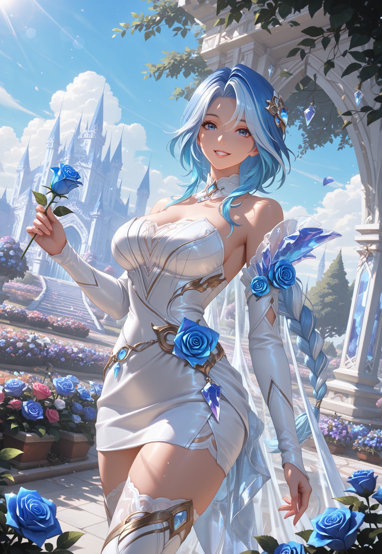 CRashe, long hair, blue hair, single braid, multicolored hair, hair ornament, blue eye, bare shoulders, detached sleeves, white dress, detached collar, cape, thighhighs, thighhighs, holding bow \(weapon\), bow \(weapon\),
