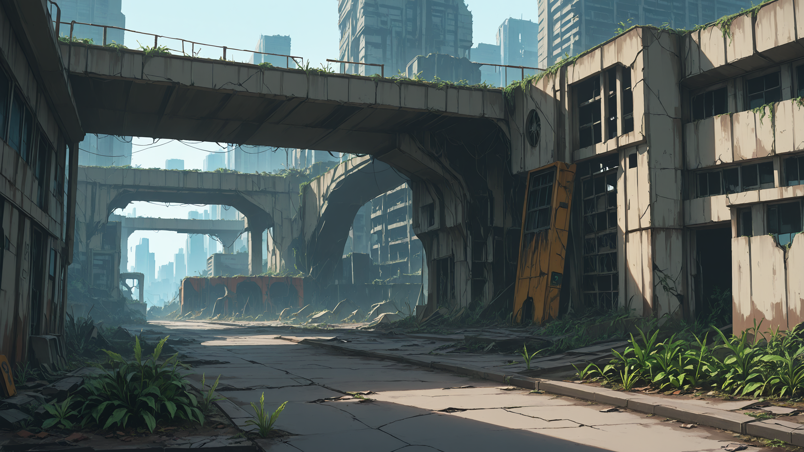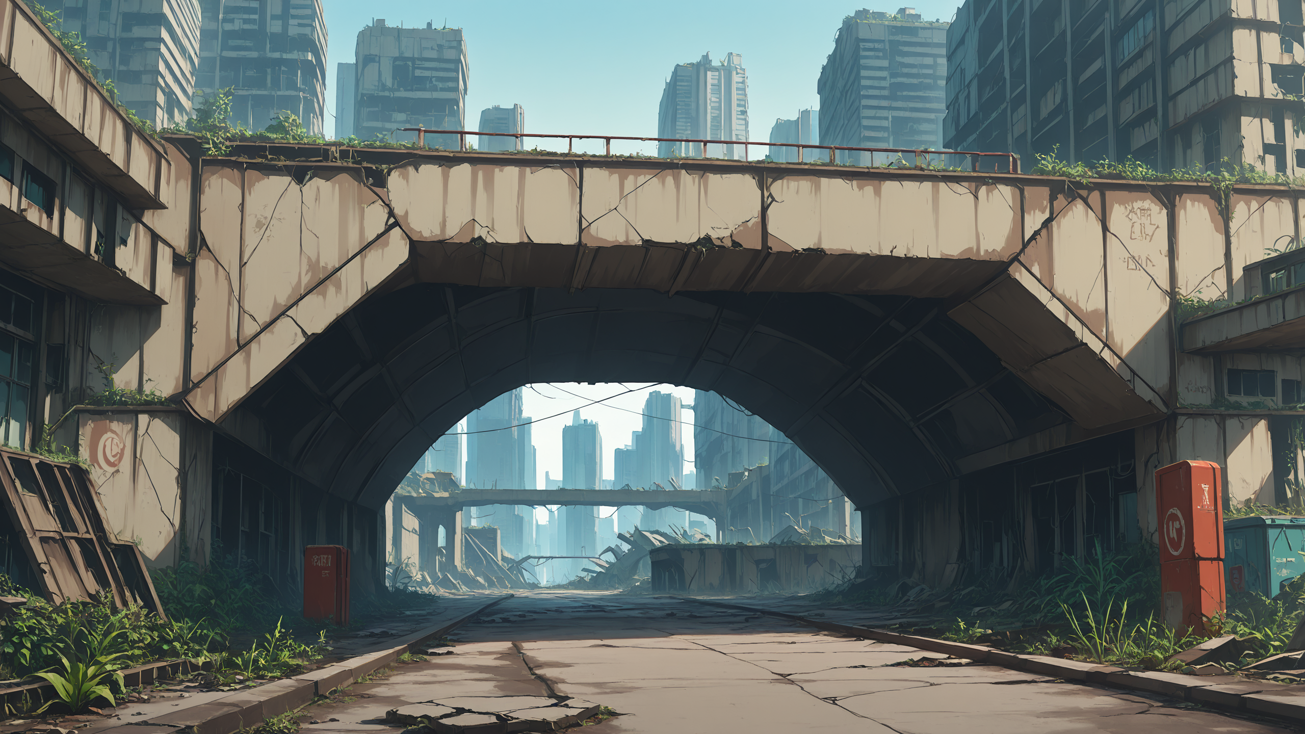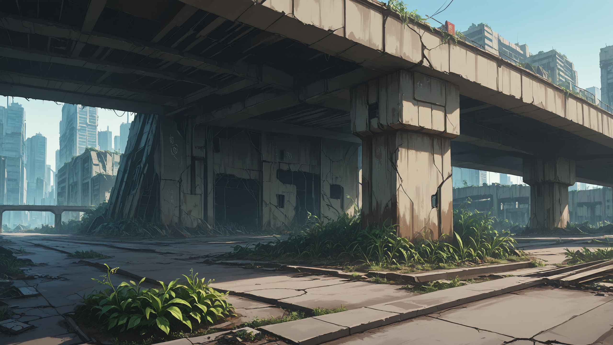 Culvert Remains, Under the bridge, no humans, scenery, ruins, science fiction, futuristic city, outdoors, building, cracked cement and roads, wildly growing plants, post-apocalypse, day.