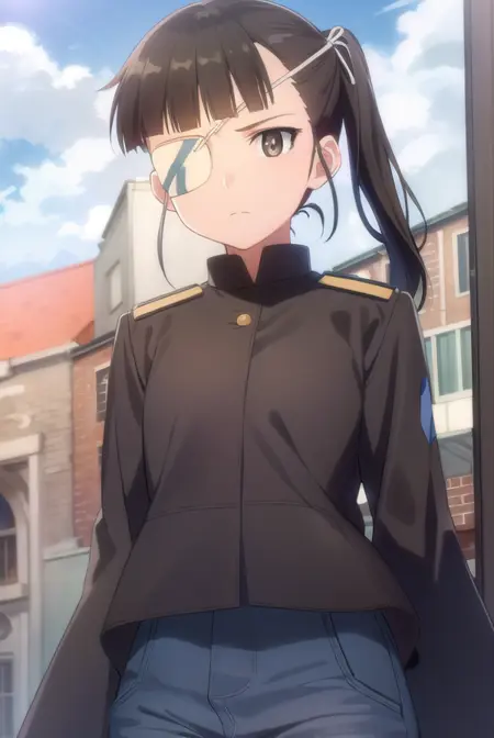 mio sakamoto, sakamoto mio, 黑发, 马尾, (黑眼:1.5), (眼罩:1.5), 刘海, 齐刘海,