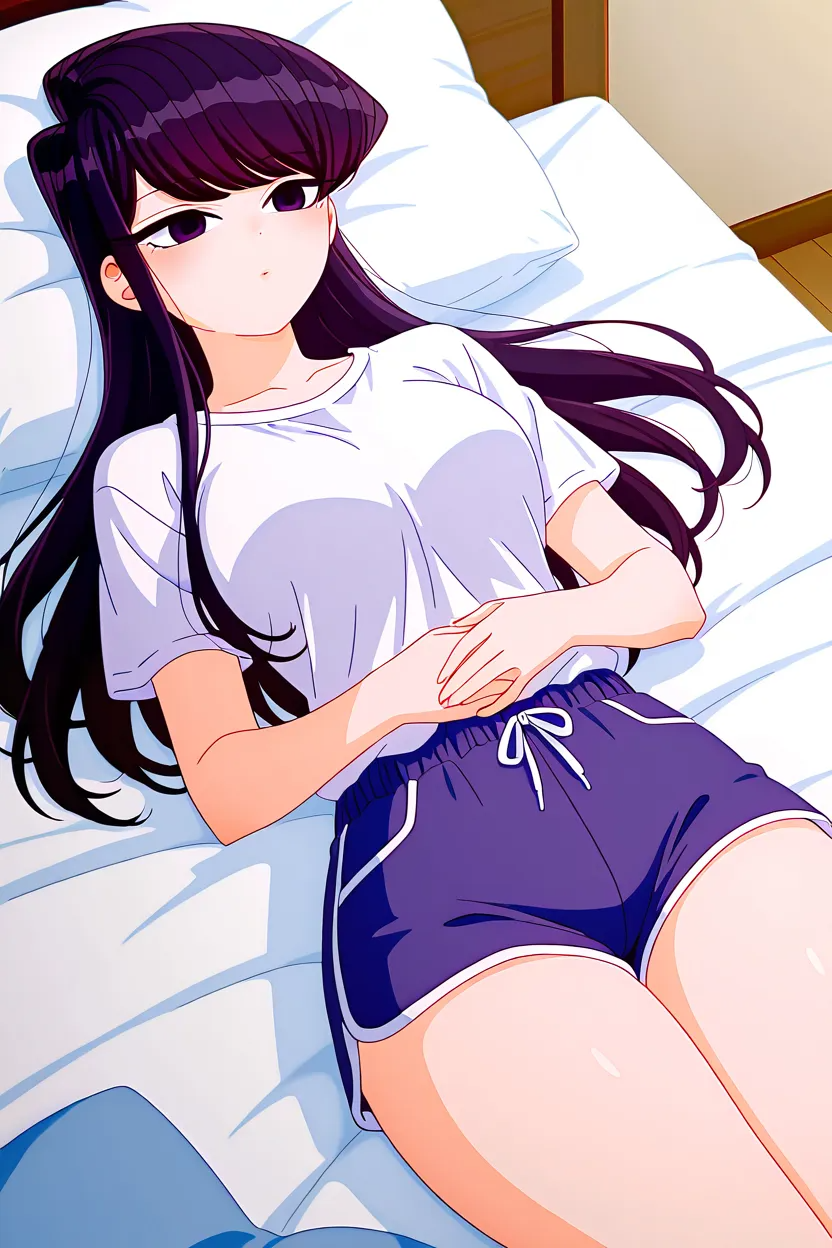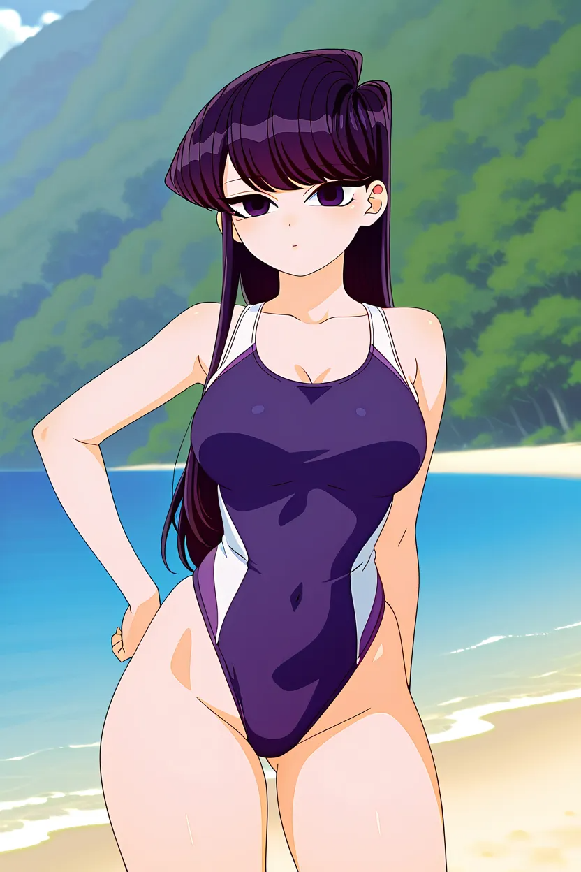 1girl, Komi Shouko (Komi Can't Communicate), black_hair, long_hair, dark purple_eyes, lips, large_breasts, komi_can't_communicate_art_style, anime drawn, 4k, HD, flaw-less, superb quality