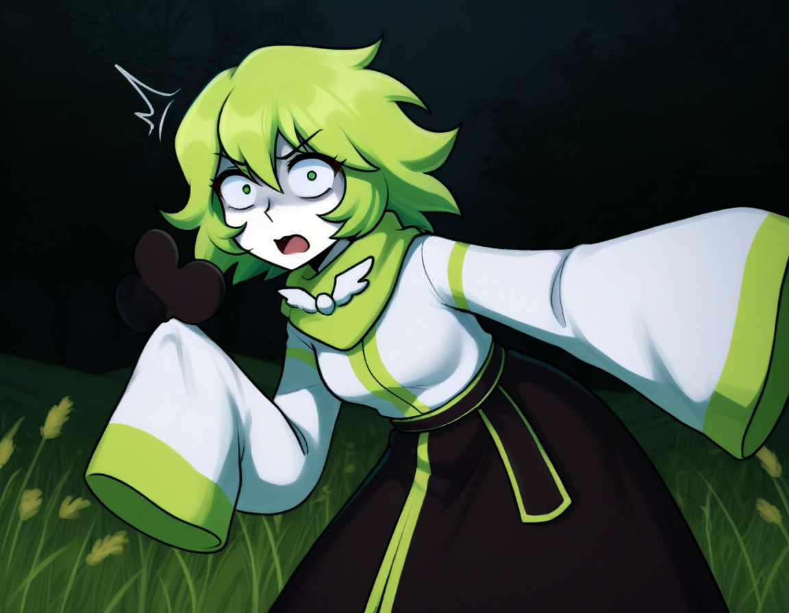 白い肌、マスク、目なし、まつげ、緑色の髪、ミディアムヘア、サイドロックス、後退させた髪、とげとげした髪、ローブ、長い袖、指より長い袖、長いスカート、緑色のネックウォーマー、ミトラ