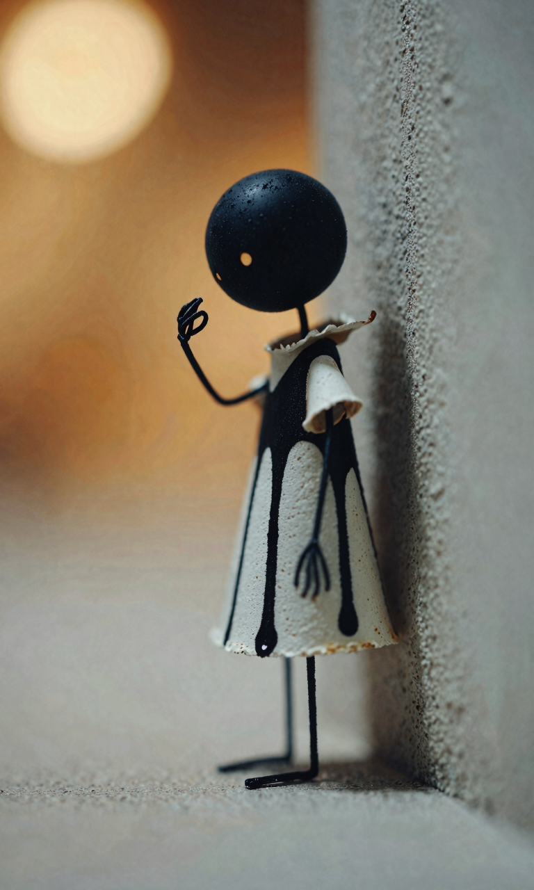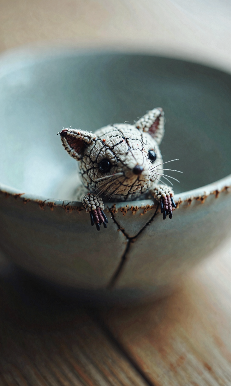 매크로 촬영, 극단적인 스케일 대비, 미니어처 피사체, 작은 인물, 취약함, 정교함, 인형 같음, 도자기, 세라믹, 바느질된 천, 철사, 종이 섬유, 먼지 입자, 균열, 결함, 닳은 질감, 수공예, 촉각적 재료, 얕은 심도, 부드러운 방향성 조명, 흐린 날씨 조명, 보케 배경, 음영 공간, 침묵한 색조, 채도 낮은 팔레트, 미세한 액센트 색, 조용한 장면, 정적, 우울함, 기묘함, 시적, 초현실적이지만 절제됨