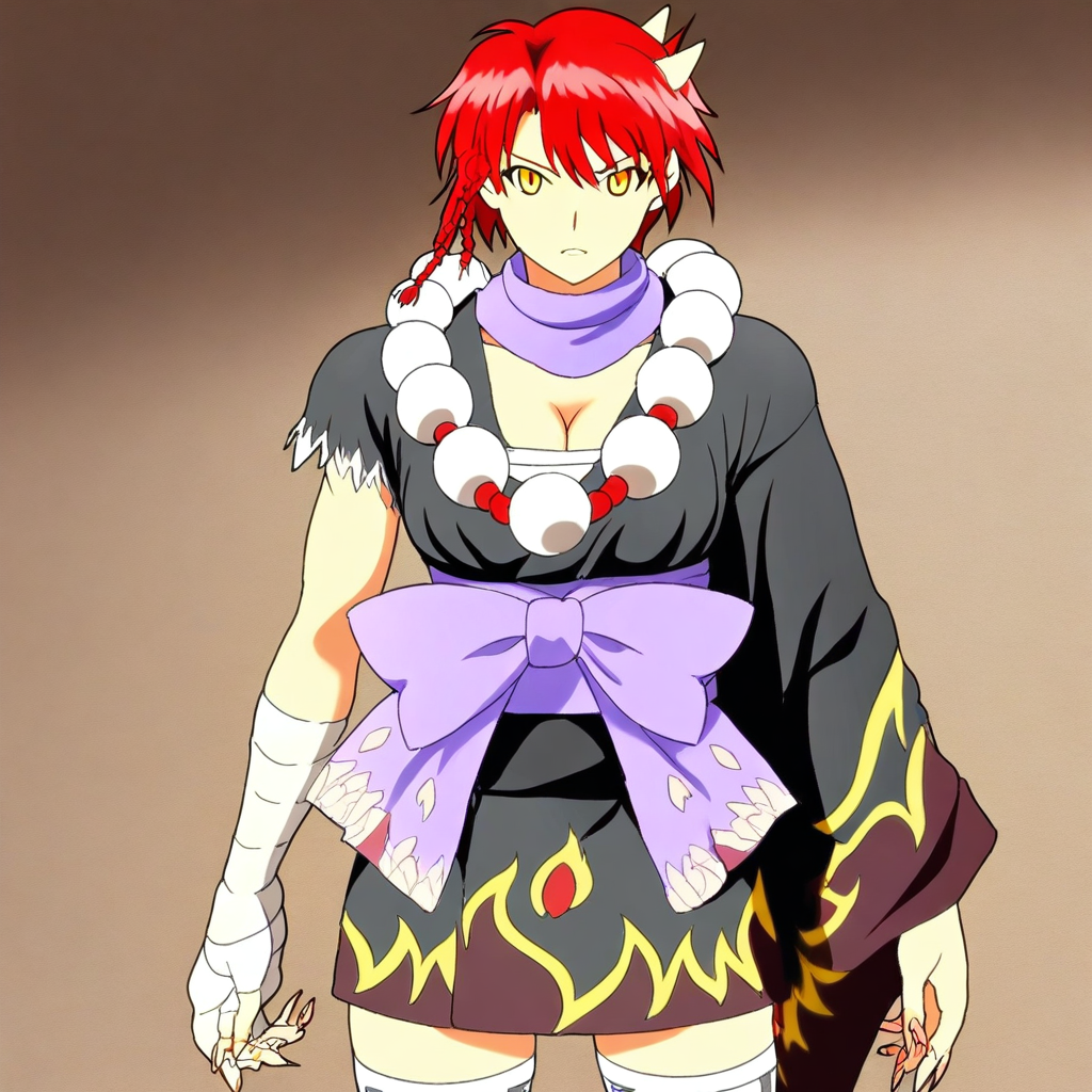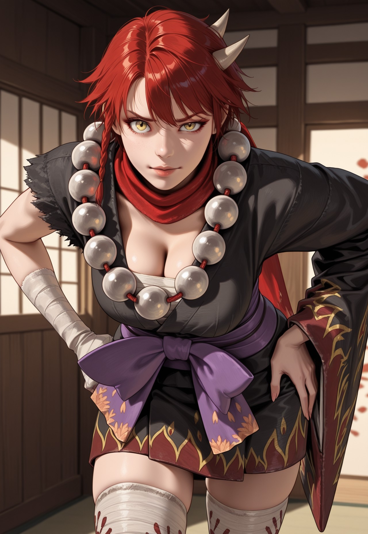 数珠、赤いスカーフ、黒い着物、胸元、巻き布、片袖、広袖、黒いスカート、帯、リボン、腕帯、太ももハイ、つま先なしレッグウェア、足首輪、