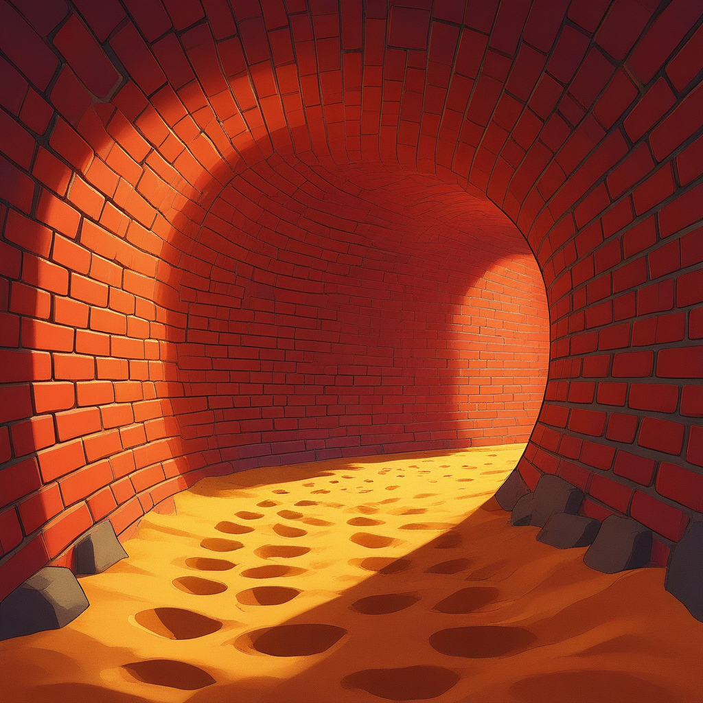 빨간 벽돌 벽, 아치형 터널, 돔형 터널 천장, 모래 바닥, 지하 복도, 긴 터널 원근, 곡선 터널 벽, 벽돌 공사, 따뜻한 인공 조명, 터널 등, 천장 조명, 지하 기지, 비밀 시설, 방어 시설 내부, 폐쇄된 공간, 깊이 원근, 반복되는 벽돌 패턴, 대칭적 터널, 산업적 분위기, 은밀한 장소, 지하 공간, 저장 터널, 군사 터널, 통제실 터널, 앰비언트 그림자, 따뜻한 색조, 깨끗한 애니메이션 라인아트, 세부적인 배경, 영화적 조명, 환경 중심