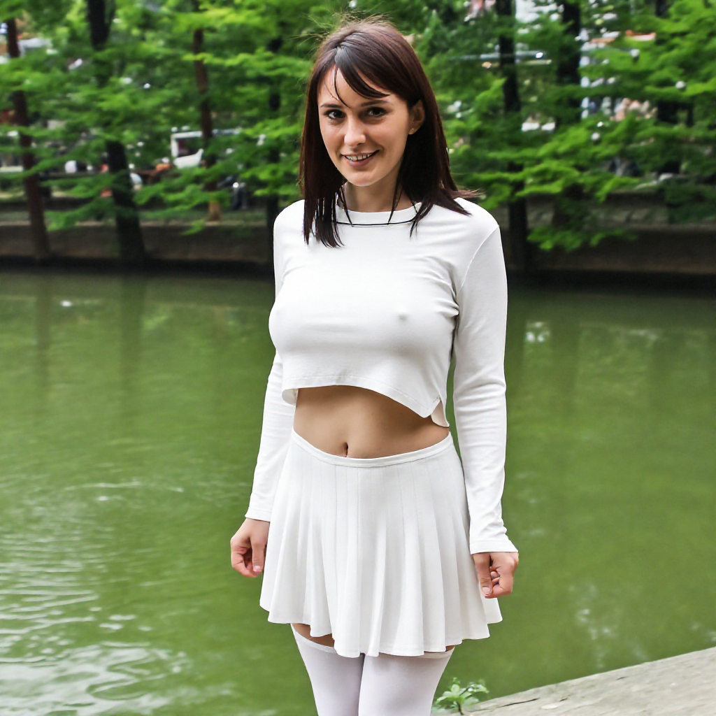 "white, sheer, revealing the outline of her breasts"