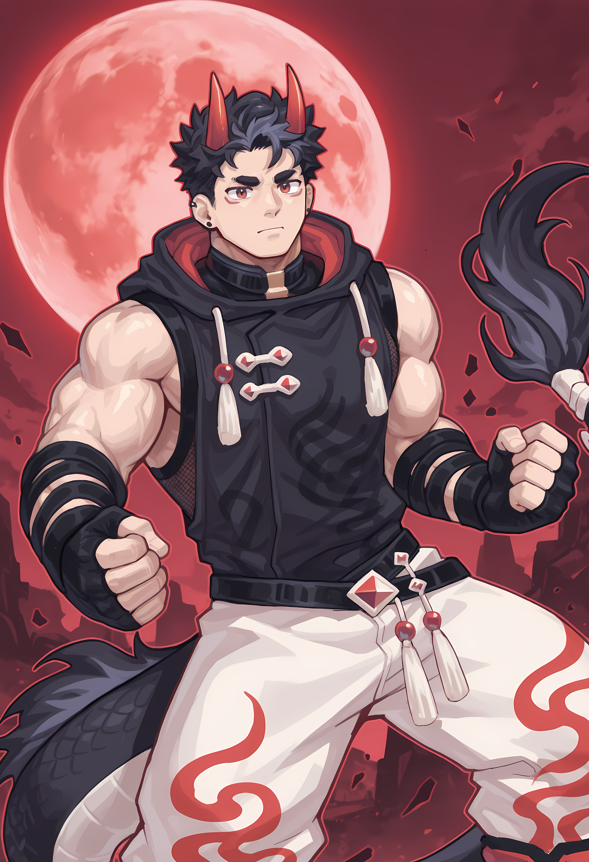 特別な衣装(例:ショーケースの画像2): kuromorisuke_2ndofficial costume, black-red-light yellow_kuromorisuke_sleeveless hoodie with fishnets undershirt, black-light yellow-red-blue_kuromorisuke_belt, black_kuromorisuke_bandages, white-red_kuromorisuke_pants, black_kuromorisuke_fingerless gloves
