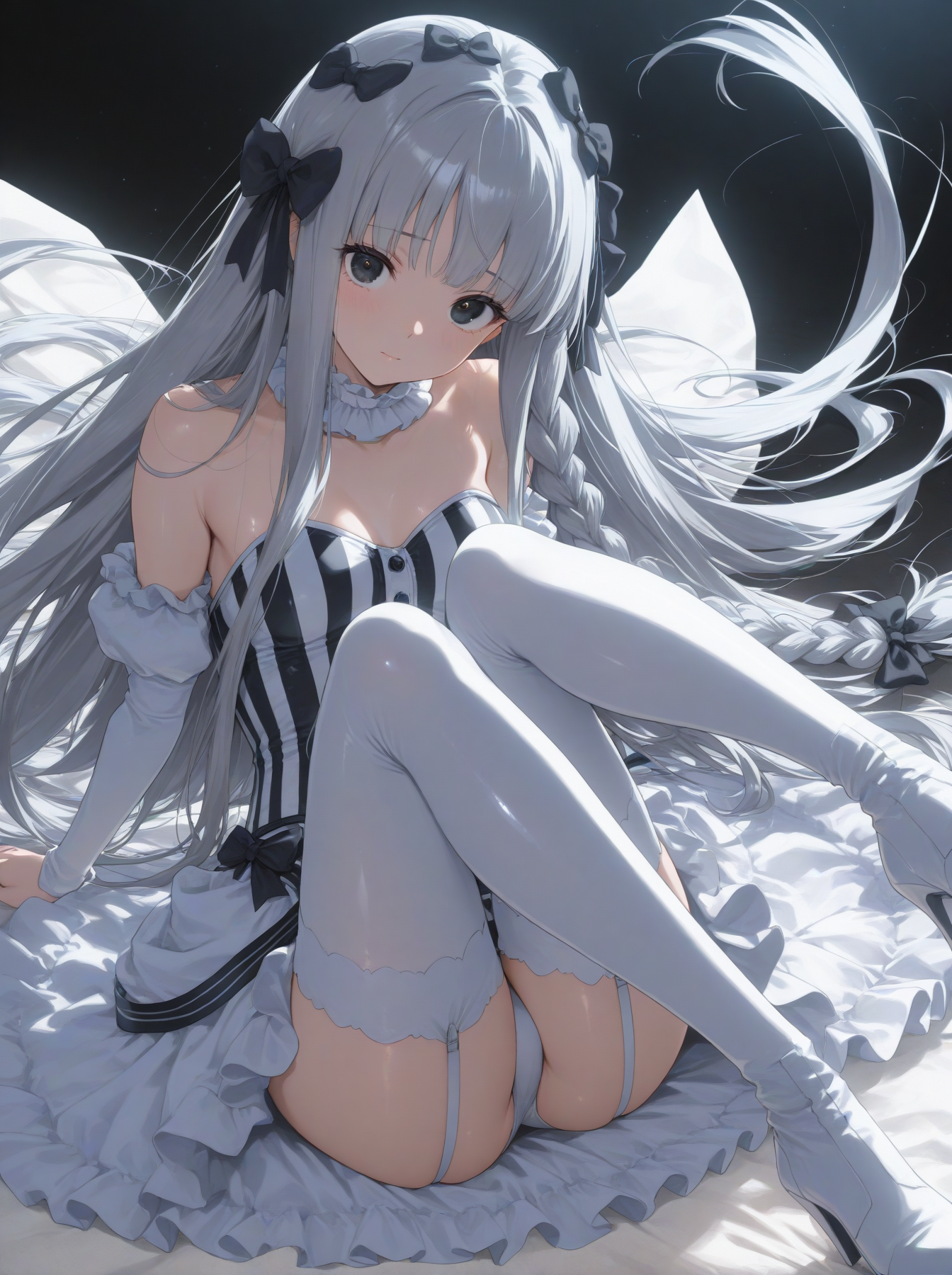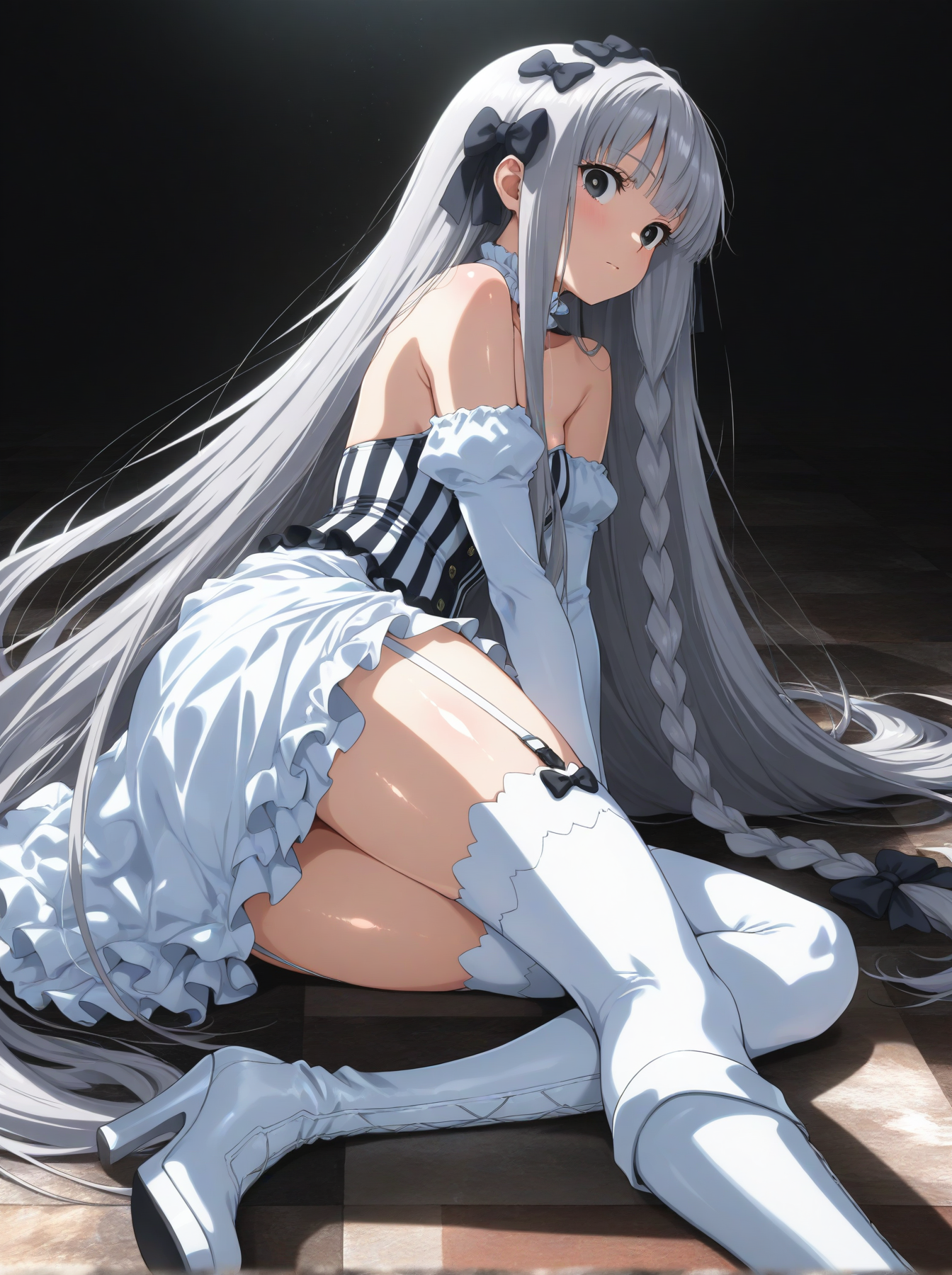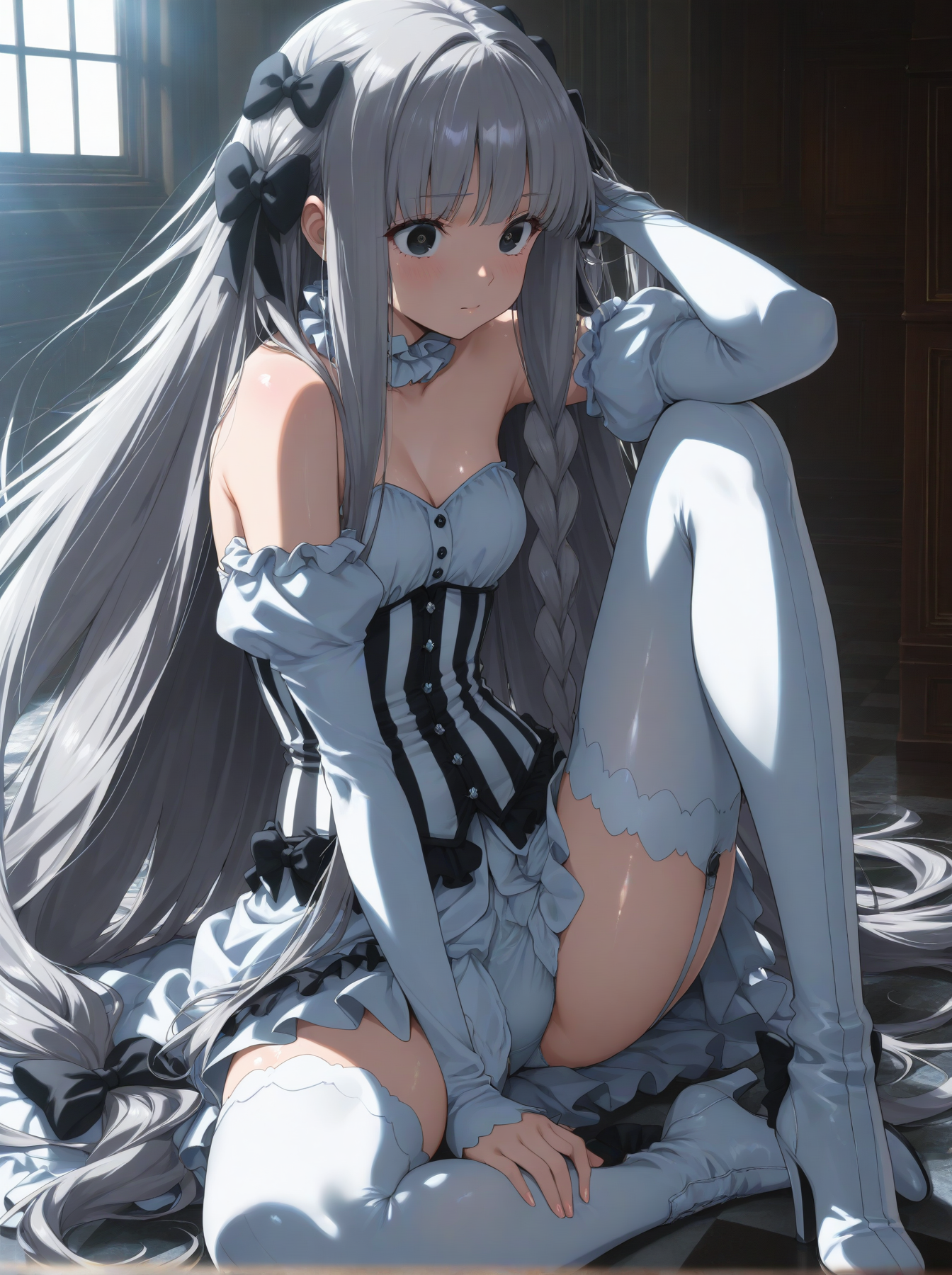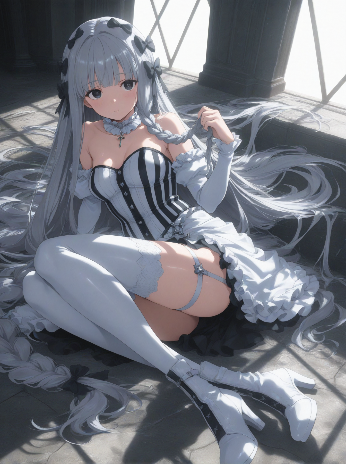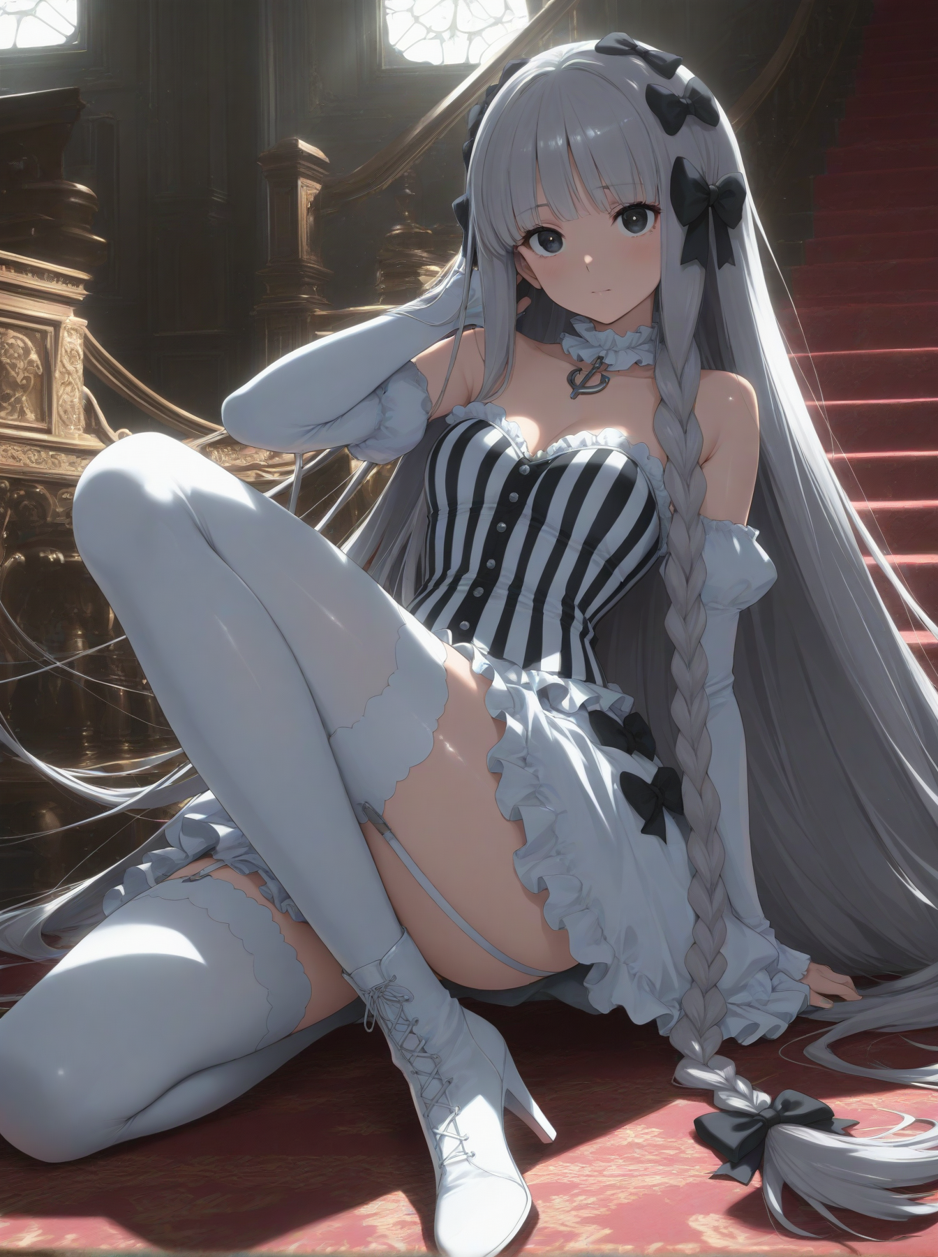 キャラクター: (FrancescaFate、黒い目、灰色の髪、非常に長い髪、サイドロックス、編み込み、(黒い髪リボン))
