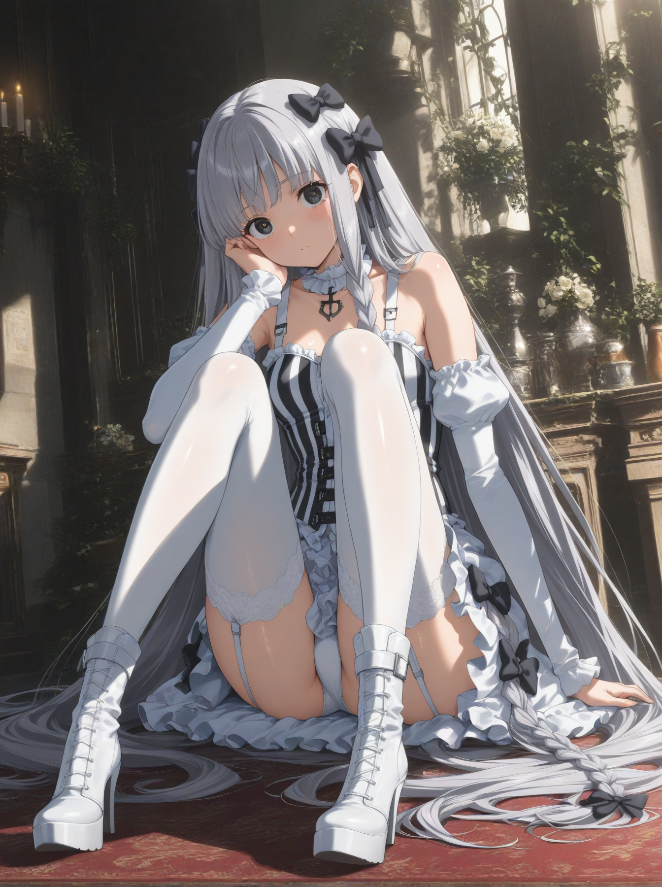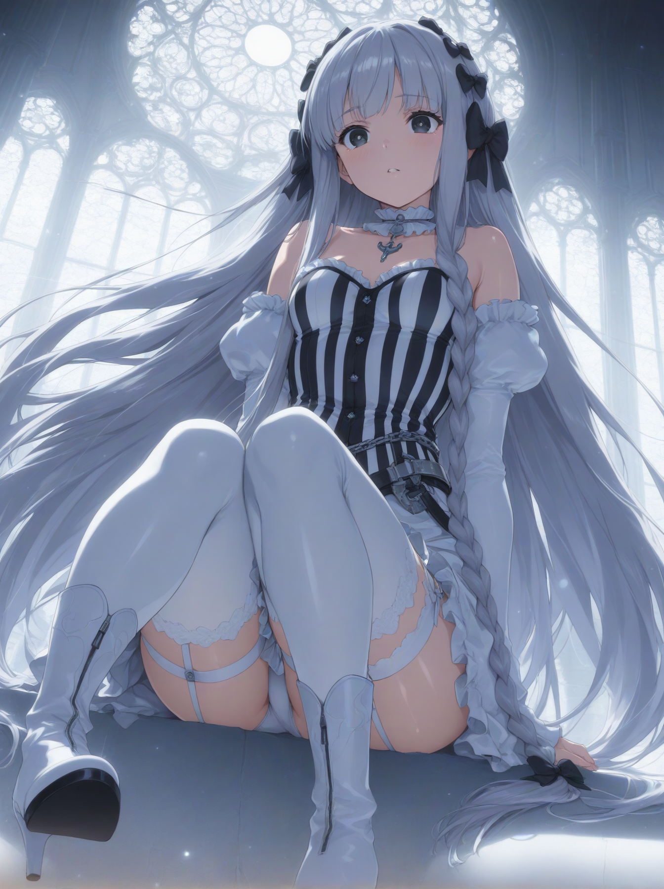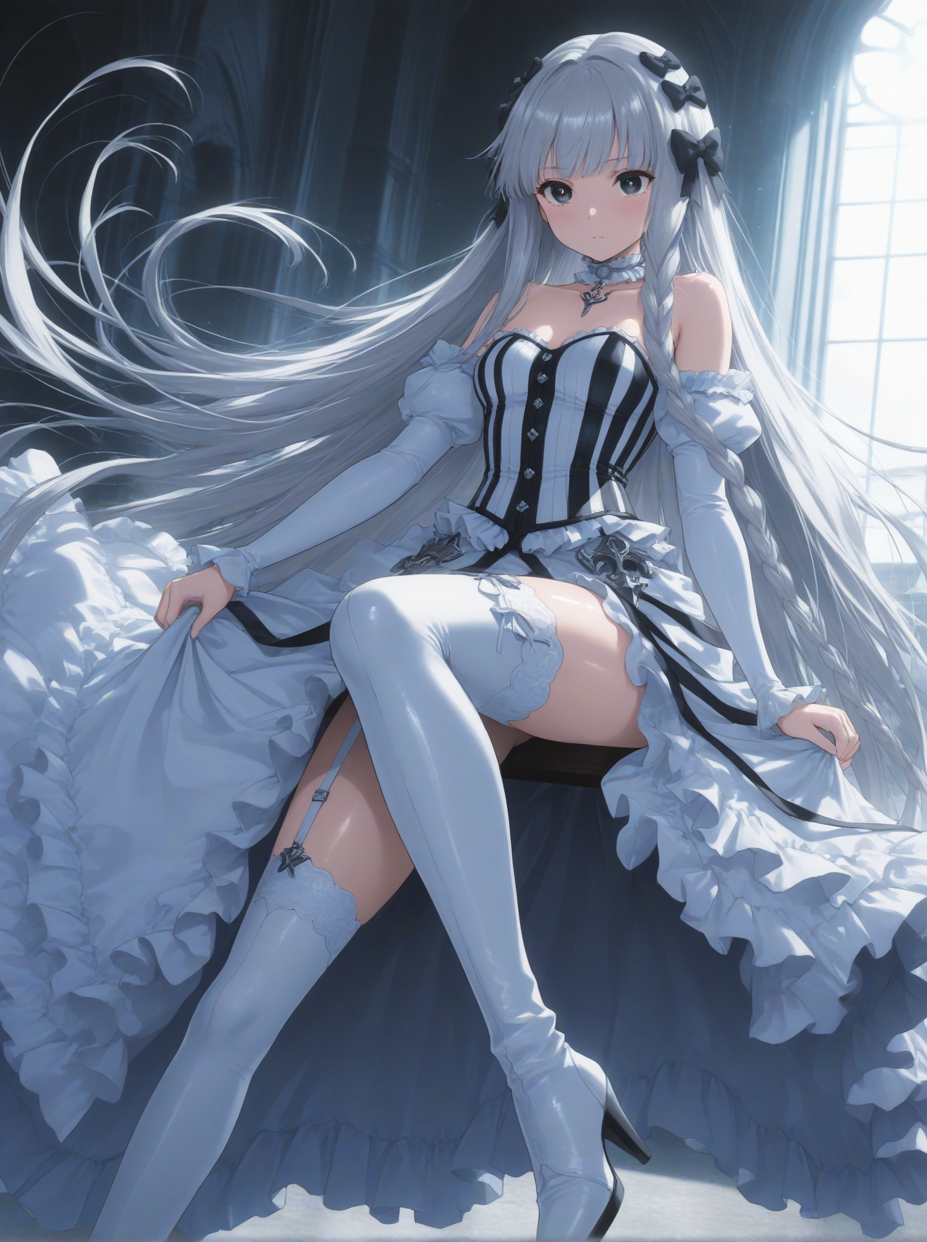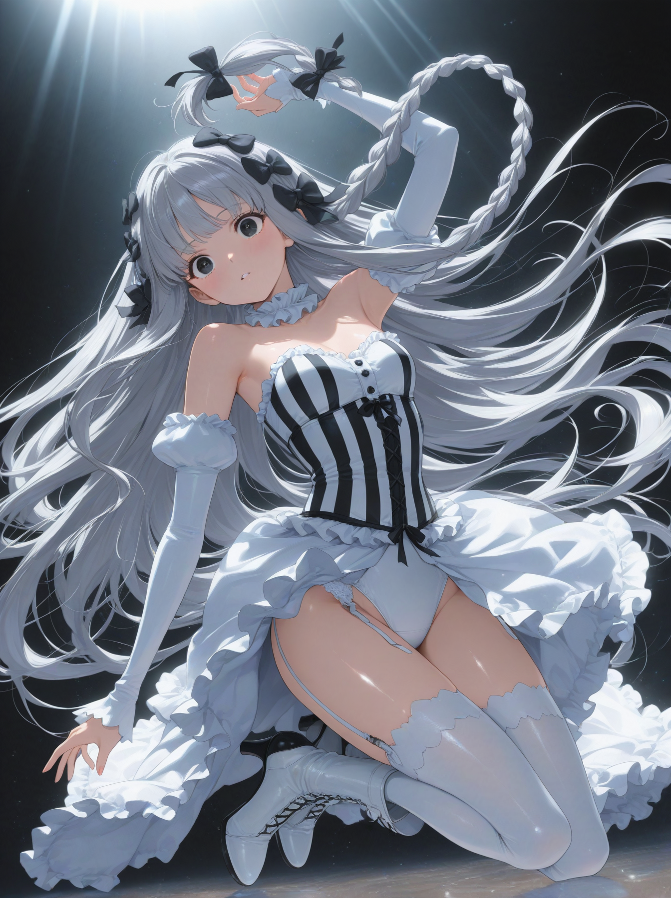 衣装: (白いチョーカー、取り外し可能な袖、ストライプのコルセット、白いショーガールスカート、白い太ももハイズ、太ももハイズストラップ、ハイヒールブーツ)