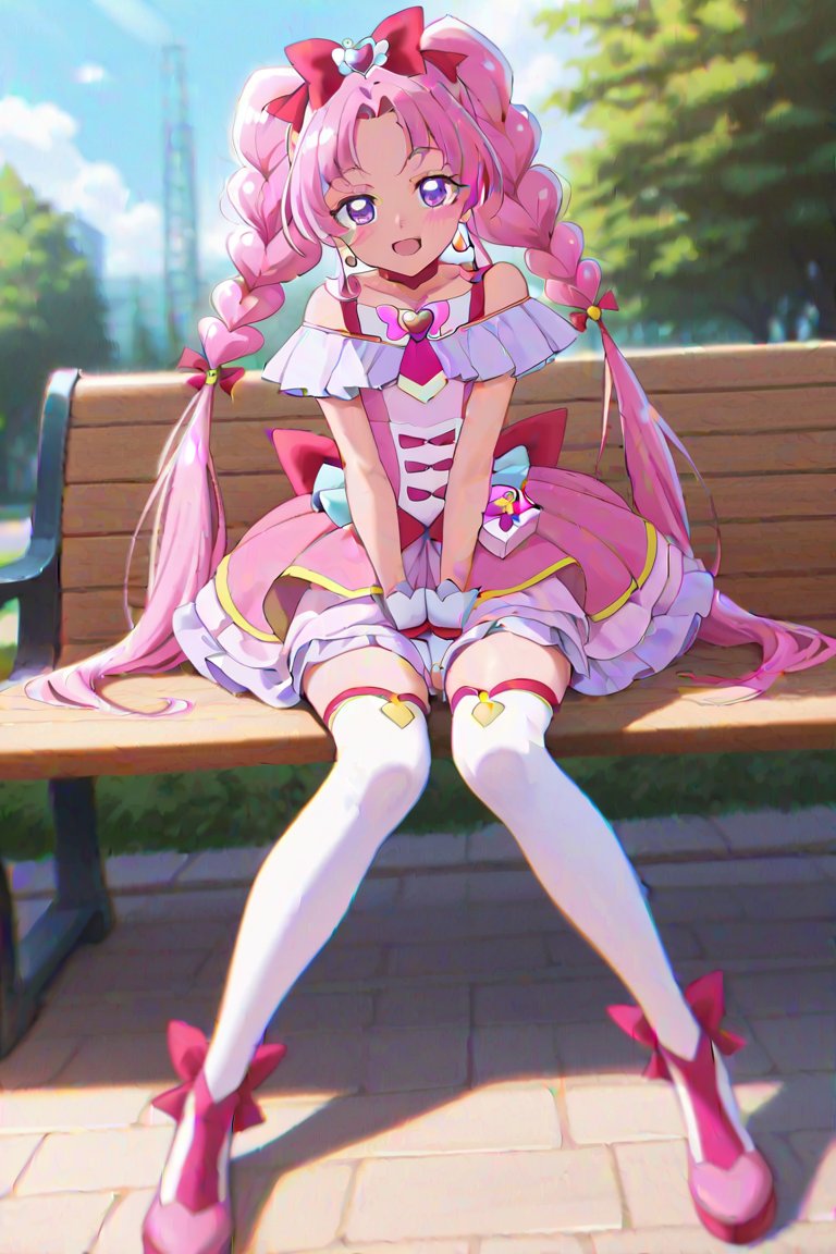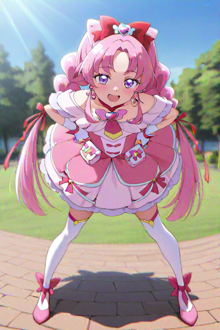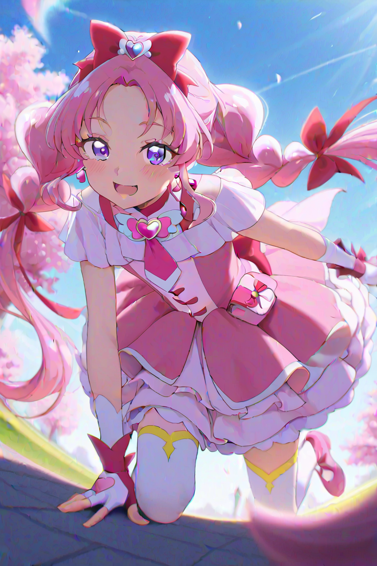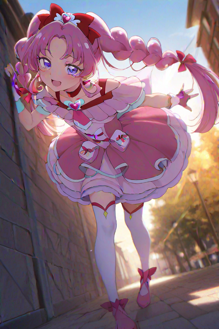 curemystique, 1girl, solo, 視聴者を見つめる, 髪飾り, リボン, ジュエリー, 非常に長い髪, ツインテール, 紫の目, フルボディ, ピンクの髪, 髪のリボン, ピアス, フリル, チョーカー, 指なし手袋, 白い太ももハイズ, 赤いリボン, ツインブレード, 短いドレス, 魔法少女, ピンクのリボン, ピンクのドレス, ポーチ, ピンクの靴下, ペチコート, ハートのブローチ, ドレスのリボン, 割れ目のある前髪, ゼッタイリョウイキ,