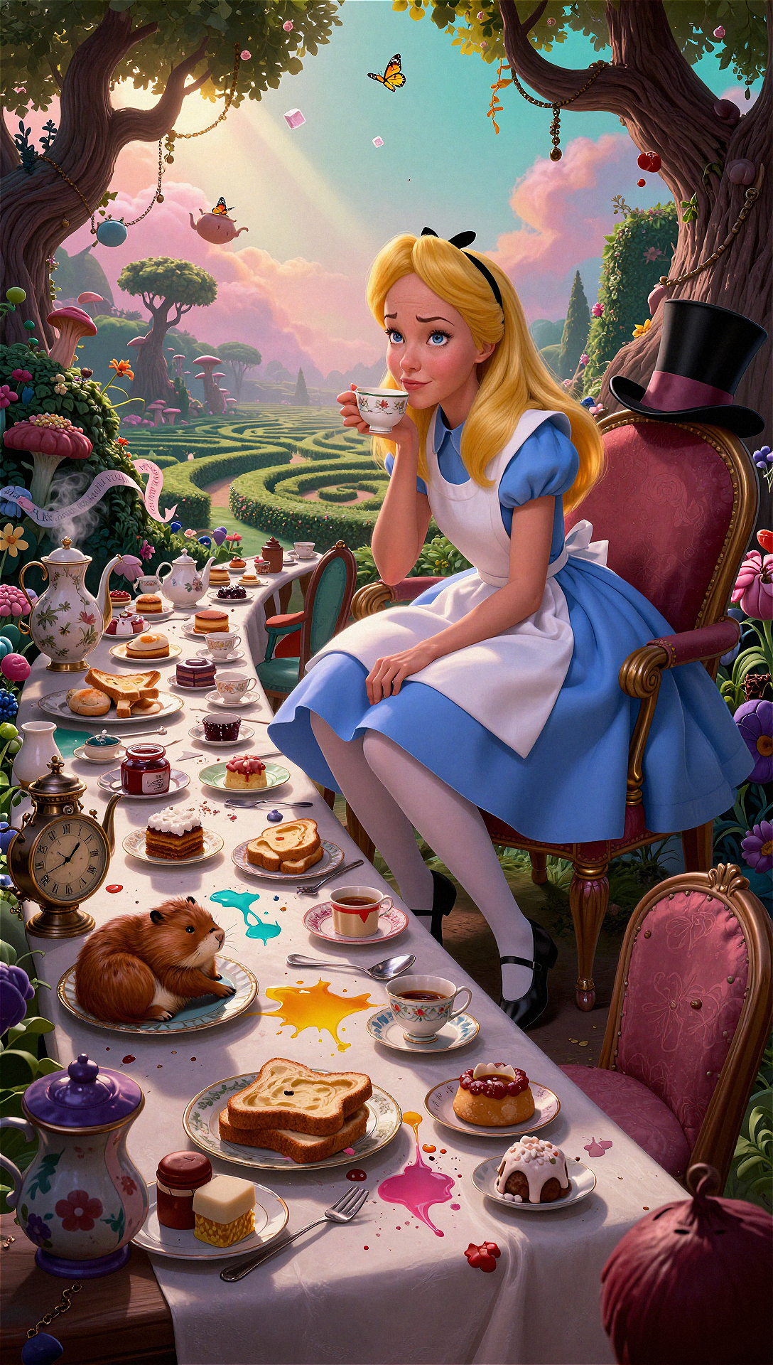 映画の中で、アリスの旅は、時計を手に急いで走る白ウサギを見かけ、そのあとを追ってウサギの穴へと落ち、不思議の国ワールドランドへとたどり着くところから始まる。そこで彼女は、謎の飲み物やケーキを口にすることで急激に体の大きさが変わるという超現実的な冒険を体験し、チェシャ猫、毛虫、トゥイードルディーとトゥイードルダム、狂った帽子屋と三月ウサギたちの混沌とした紅茶会、そして専制的なハートの女王といった個性的な住人たちと出会う。これらのエピソードは、アリスがワールドランドの非論理的なルールや登場人物に苛立ちを覚えながら、パズルやなぞかけ、脅威に立ち向かいながらも家に帰りたいと願う様子を浮き彫りにする。
