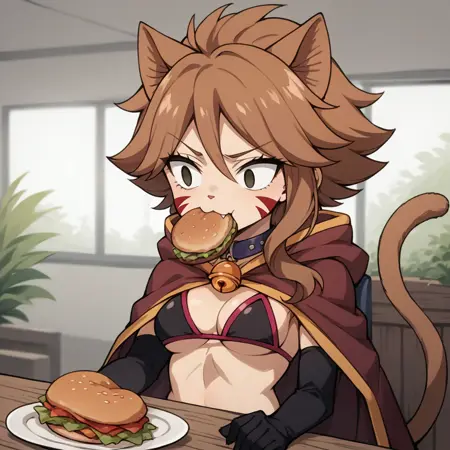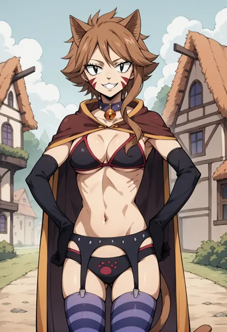 복장 - 비키니, 검은 브라, 망토, 팔꿈치 장갑, 줄무늬 허벅지 양말, 목걸이(또는 초커), 종, 속옷, 가터 벨트, 부츠, 고양이 꼬리