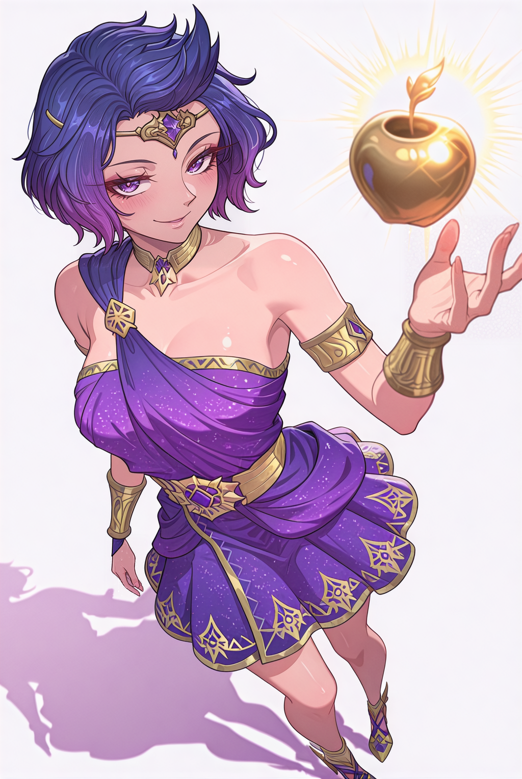discordia_zthx_IL、多色の髪、青い髪、紫の髪、短い髪、肩を露出、紫の目、装飾的な金の冠、金のネックレス、中程度の胸