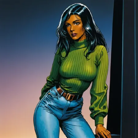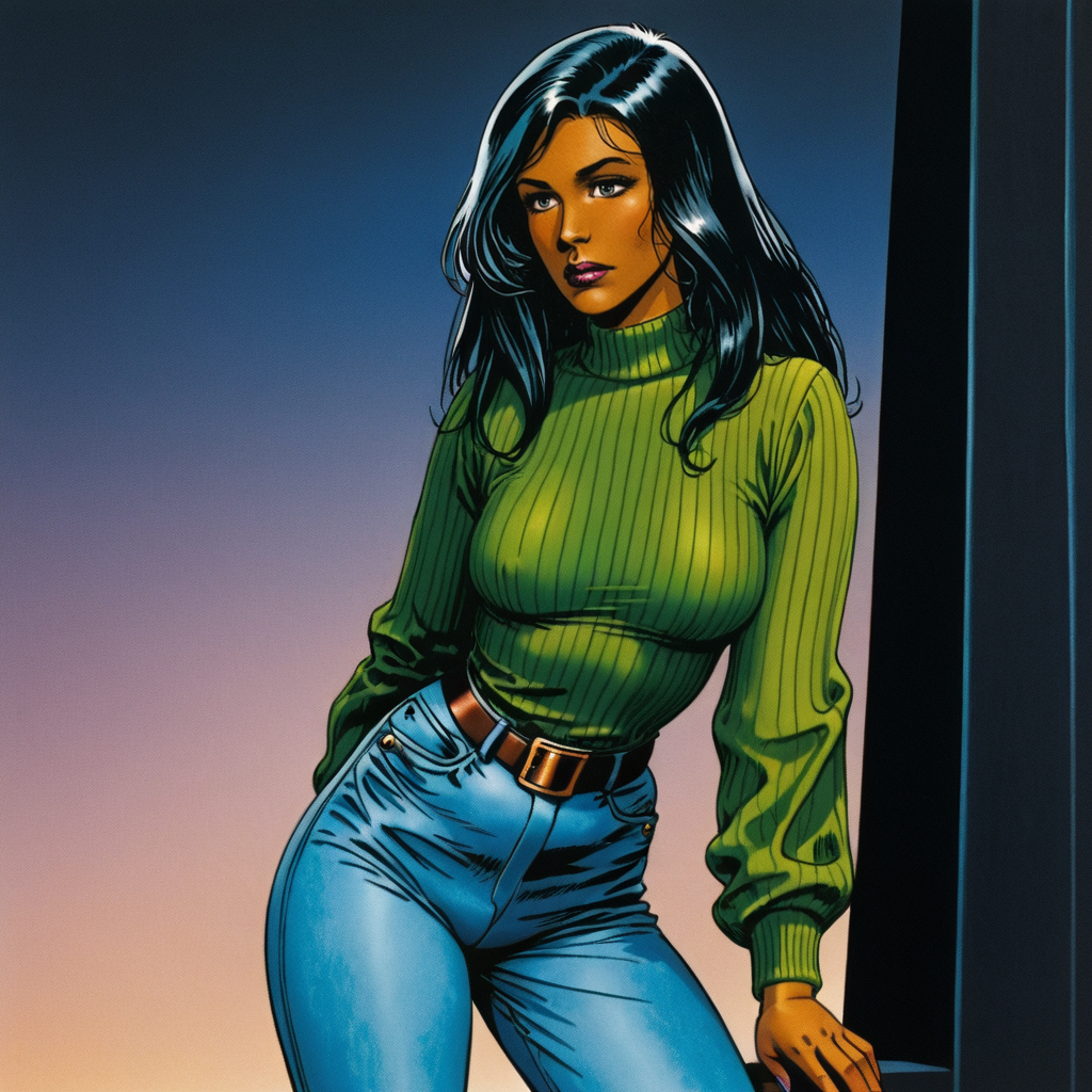 • Trigger : Valkyrie, 1girl, black hair, medium breasts, lipstick, belt, open shirt, open clothes, retro artstyle, makeup, no bra, pants, long hair, dark skin, lips, plunging neckline, green shirt, 1980s (style)