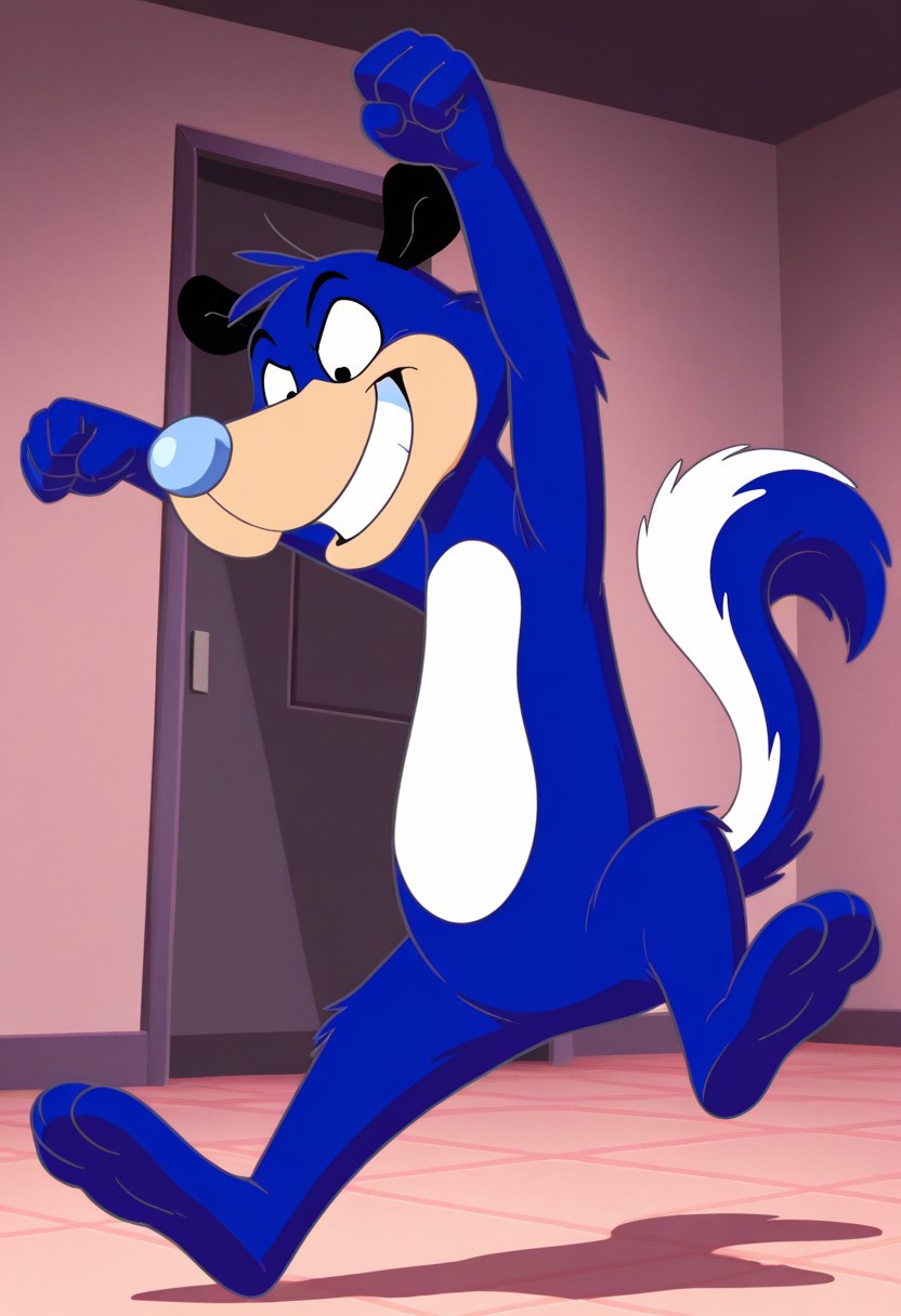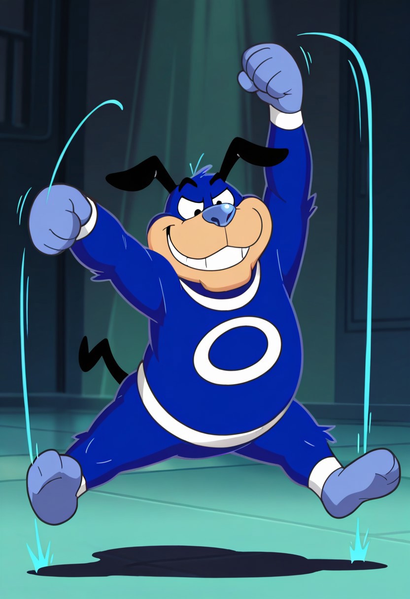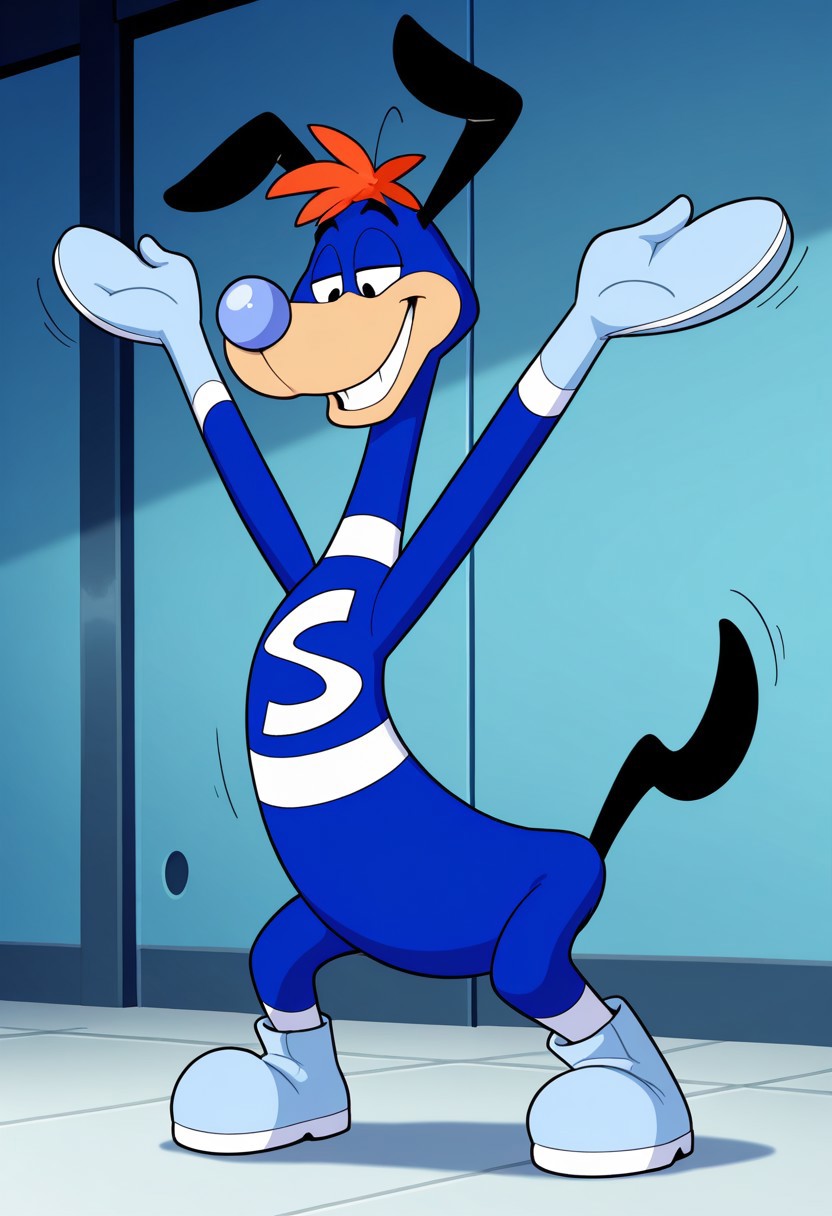 Stretch-O-Mutt(ヒーロー): Stretch-O-Mutt、単独、1boy、犬、黒い目、オレンジ色の髪、黒い耳、青い鼻、茶色い鼻先、黒い尾、青い衣装、白い縞模様、胸に「S」のロゴ、薄い青のブーツ