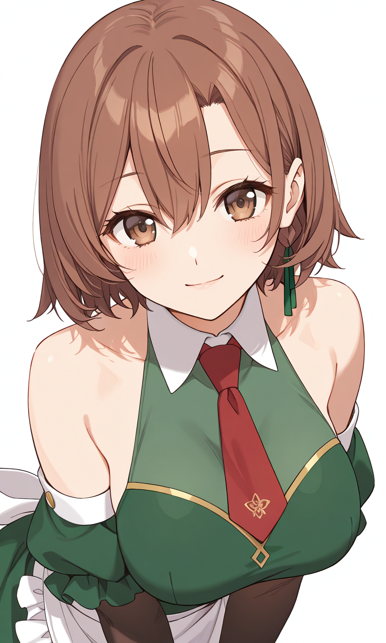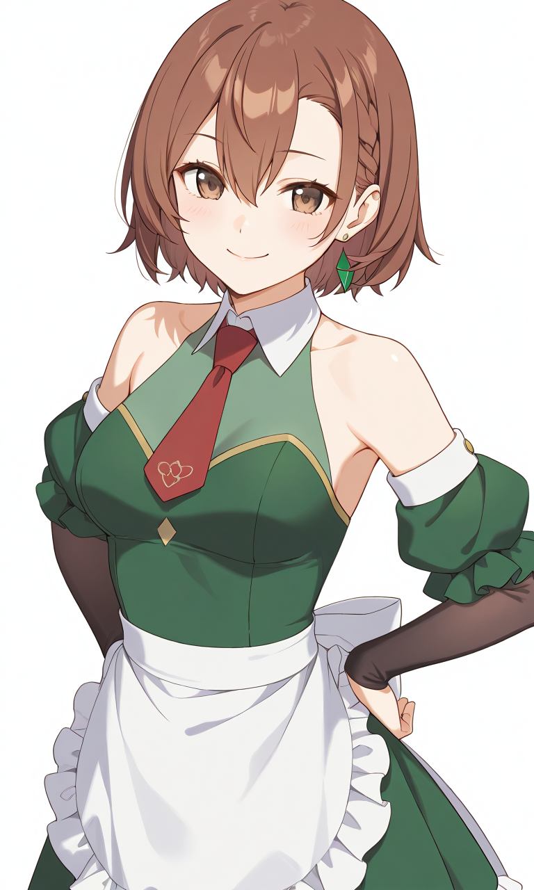 - lola metrose, 드러난 어깨, 갈색 눈, 갈색 머리카락, 분리된 소매, 주름진 앞치마, 녹색 드레스, 녹색 치마, 눈 사이의 머리카락, 넥타이, 빨간 넥타이, 단발, 흰색 앞치마,