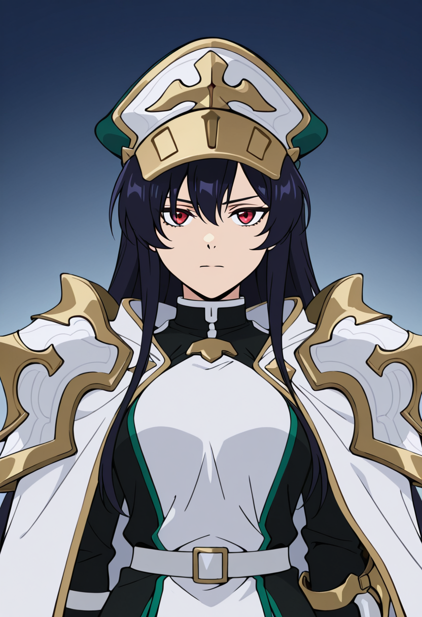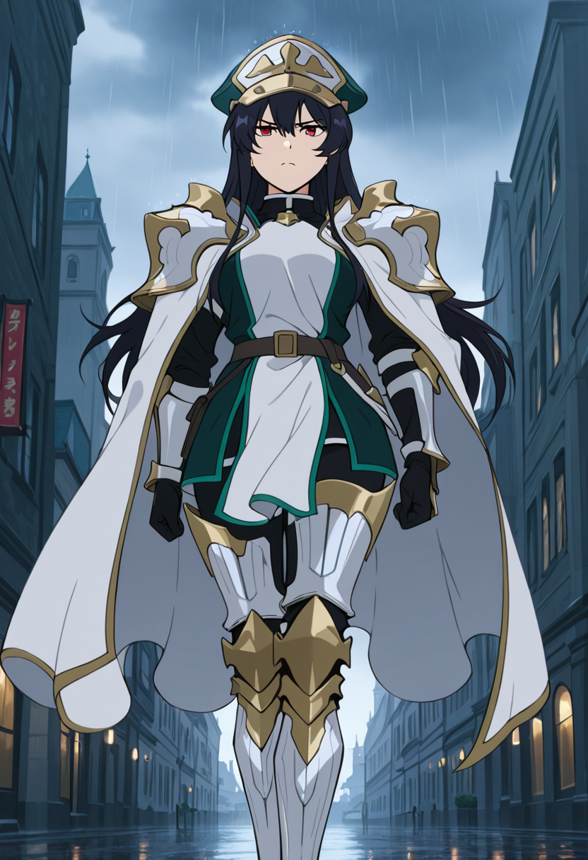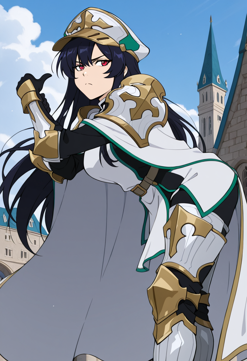 military hat, white armor, shoulder armor, pauldrons, white cape, green trim, black gloves, leg armor, white footwear, knee boots, armored boots