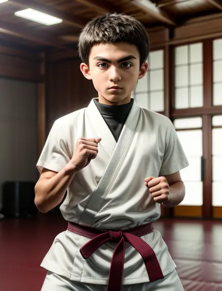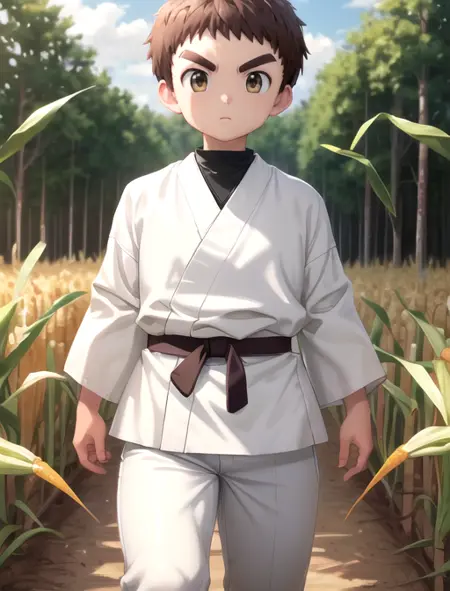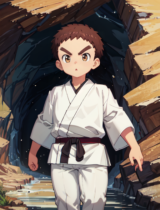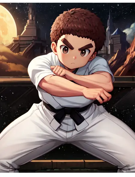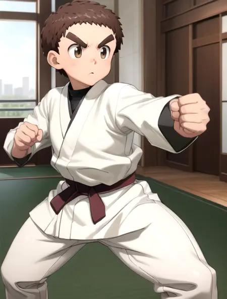 追加で役立つワード: [禿頭 : 短髪: 0.4]、茶髪、道着、濃い眉、男の子