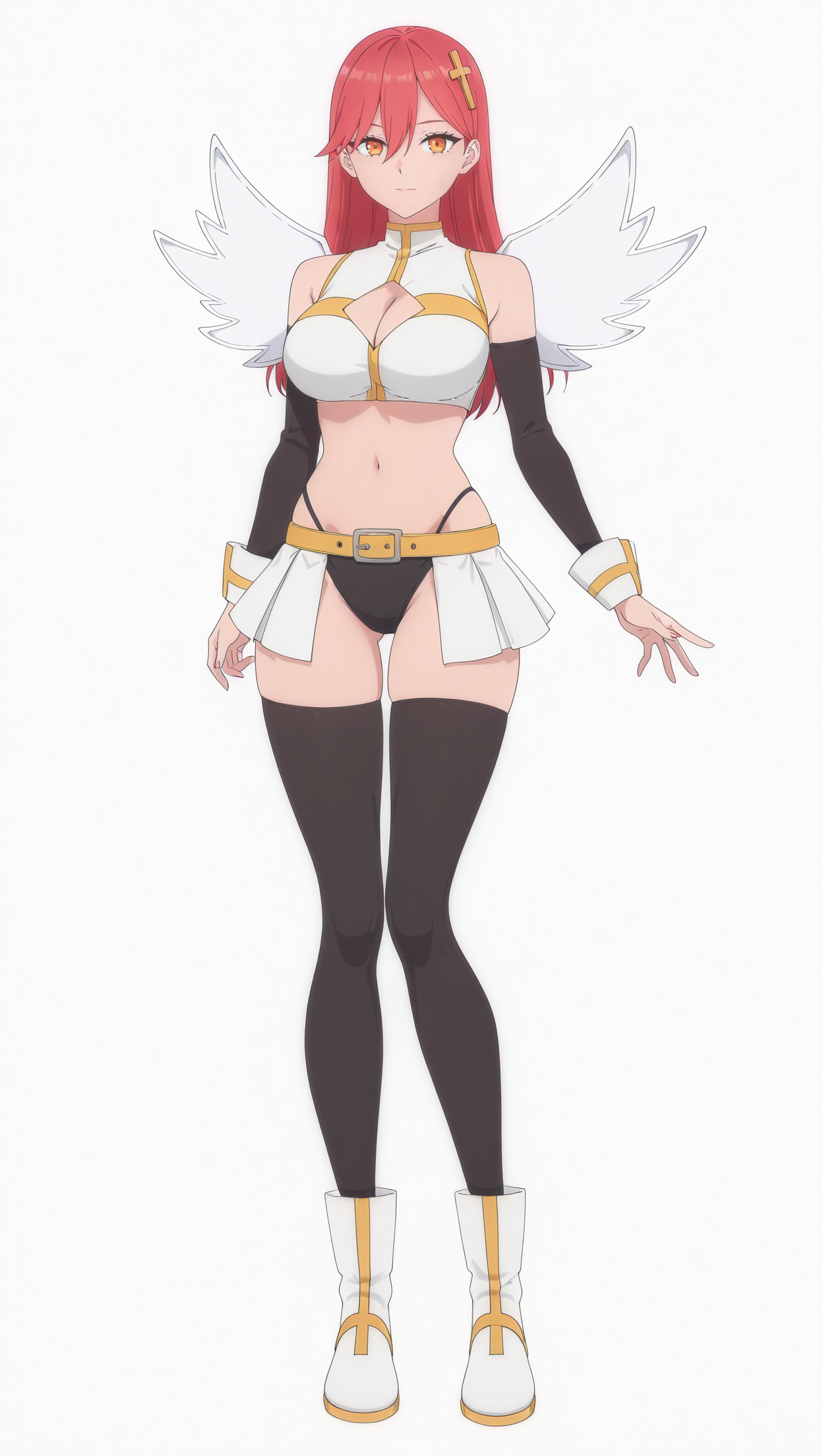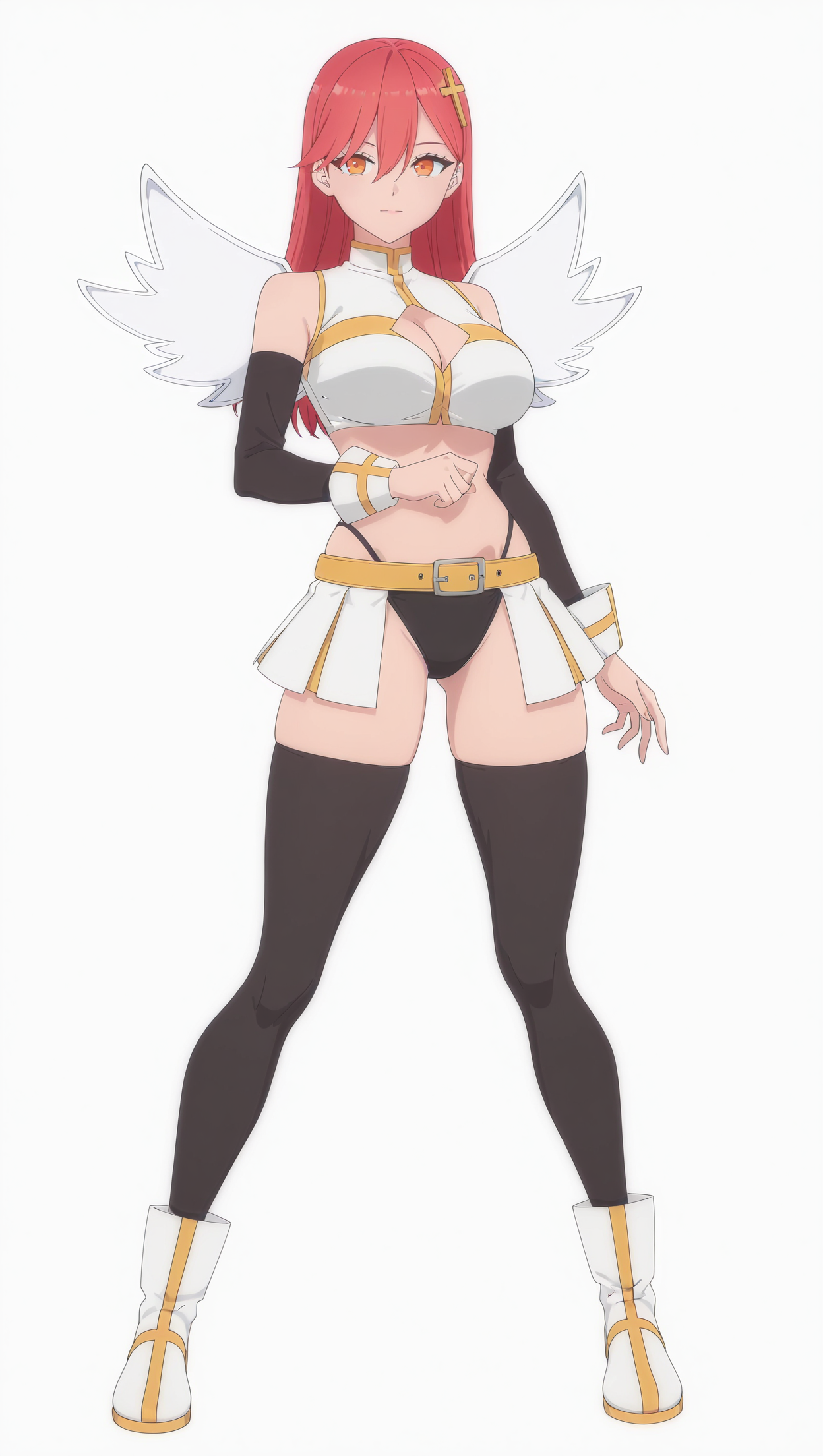anime coloring, masterpiece, best quality, amazing quality, 4r13l, 1girl, long hair, red hair, orange eyes, large breasts, cross hair ornament, top, white top, cleavage cutout, bare shoulders, detached sleeves, black sleeves, highleg panties, black panties, belt, yellow belt, microskirt, white skirt, thighhighs, black thighhighs, boots, white footwear, wings, white wings, solo, pose, standing, looking at viewer, from front, ((((white background, simple background))))