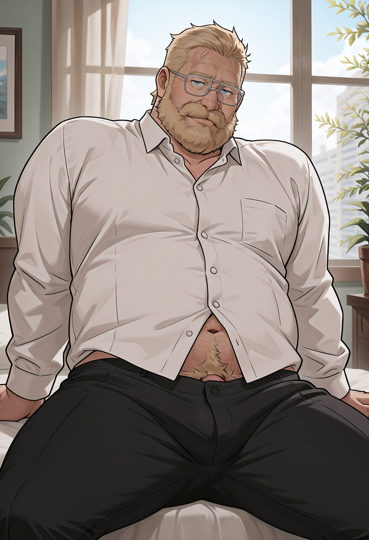 노란 머리, 짧은 머리, 풀수염, 콧수염, 통통한 체격, 안경, 파란 눈,