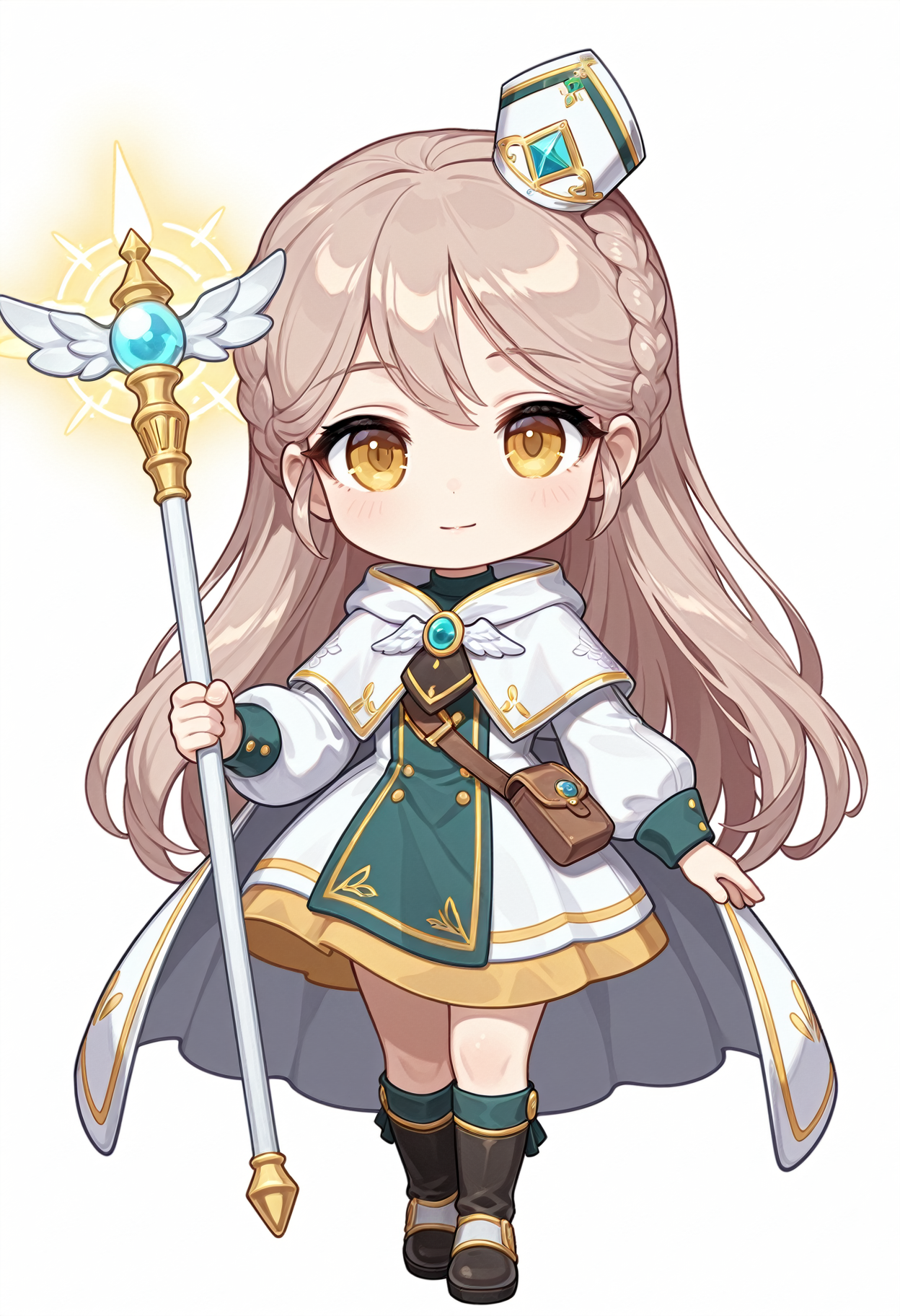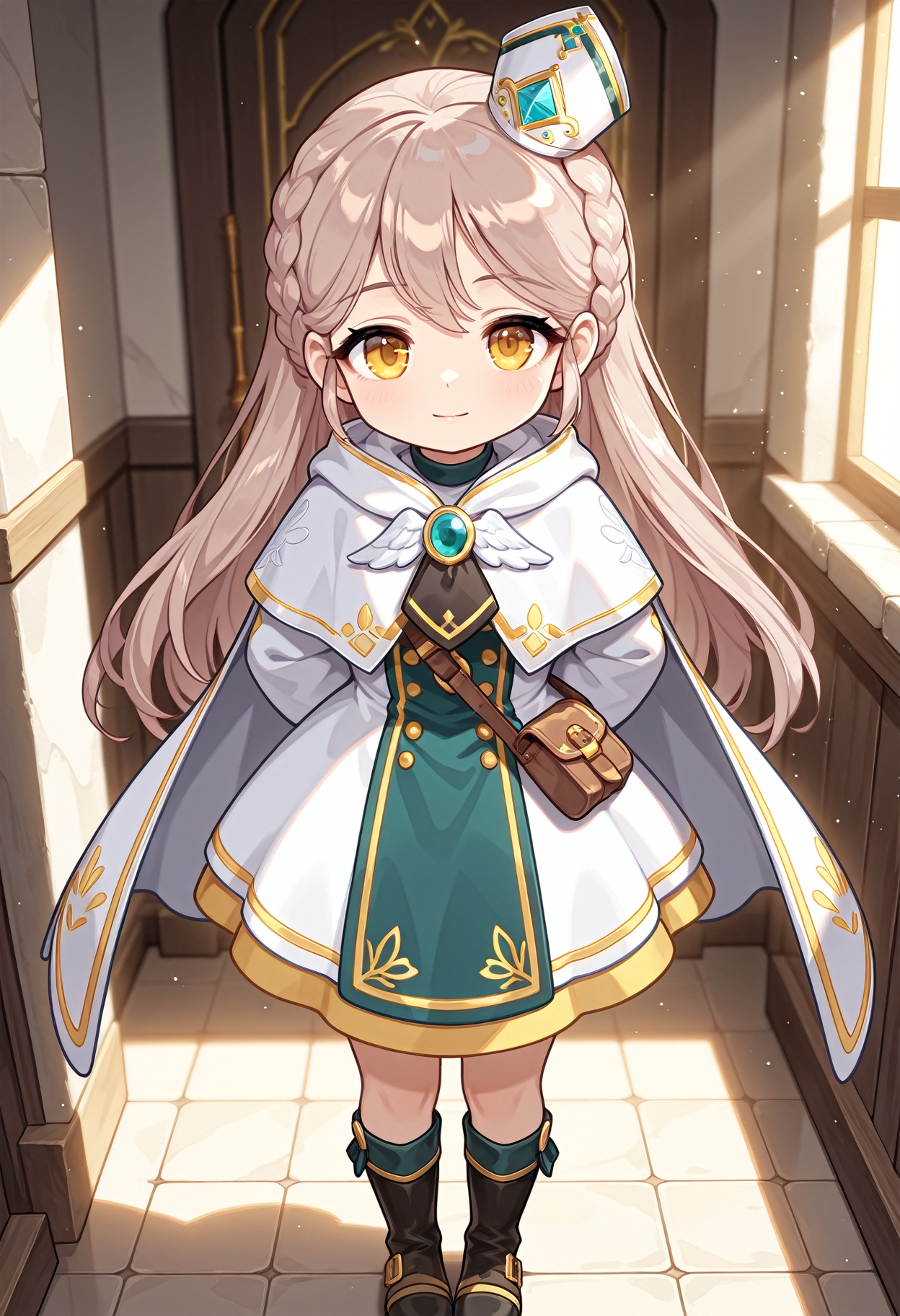 1소녀, 싱글, 치비, 땋은 머리, 브로치, 후드 캐플릿, 드레스, 미니 모자, 미트레, 긴 머리, 긴 소매, 갈색 머리, 부츠