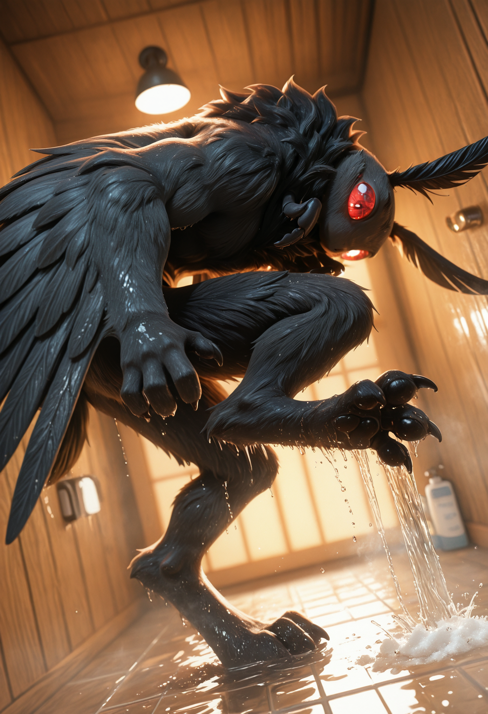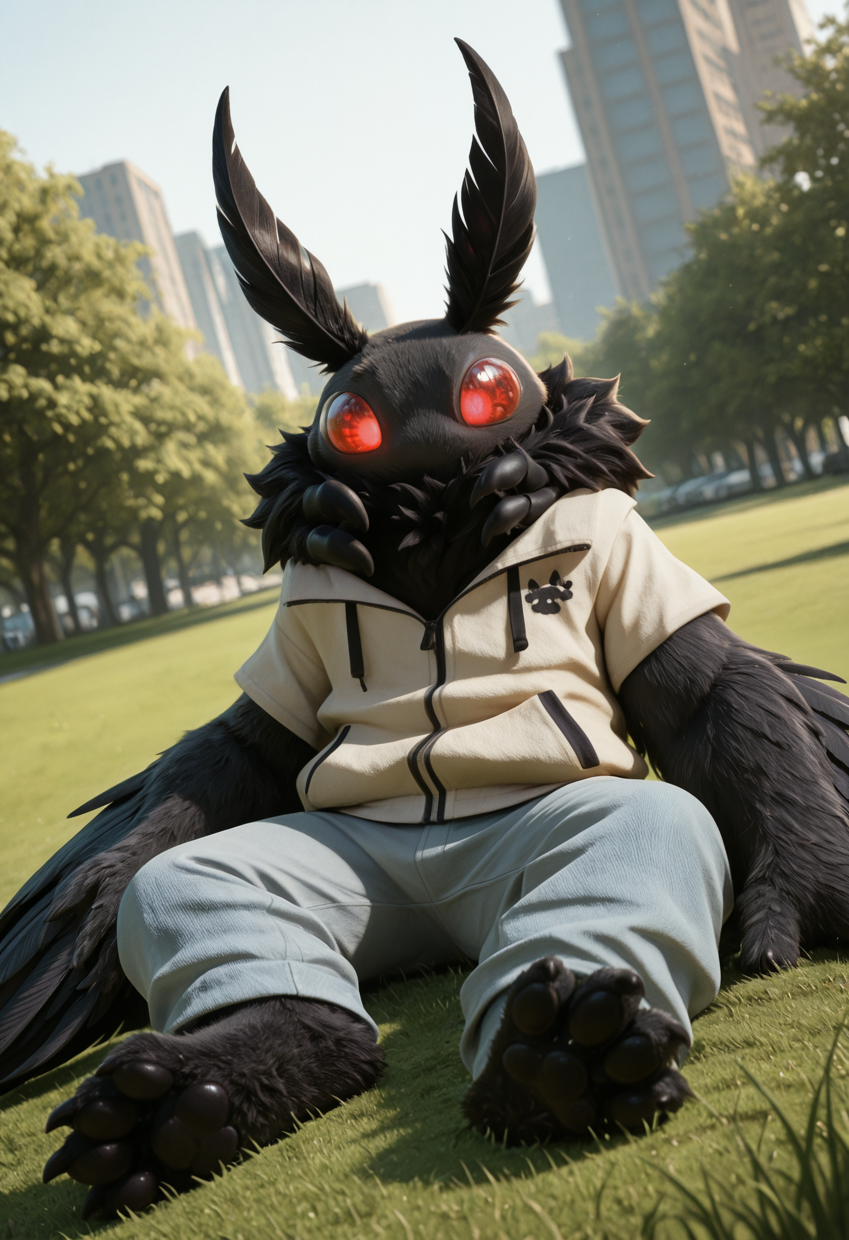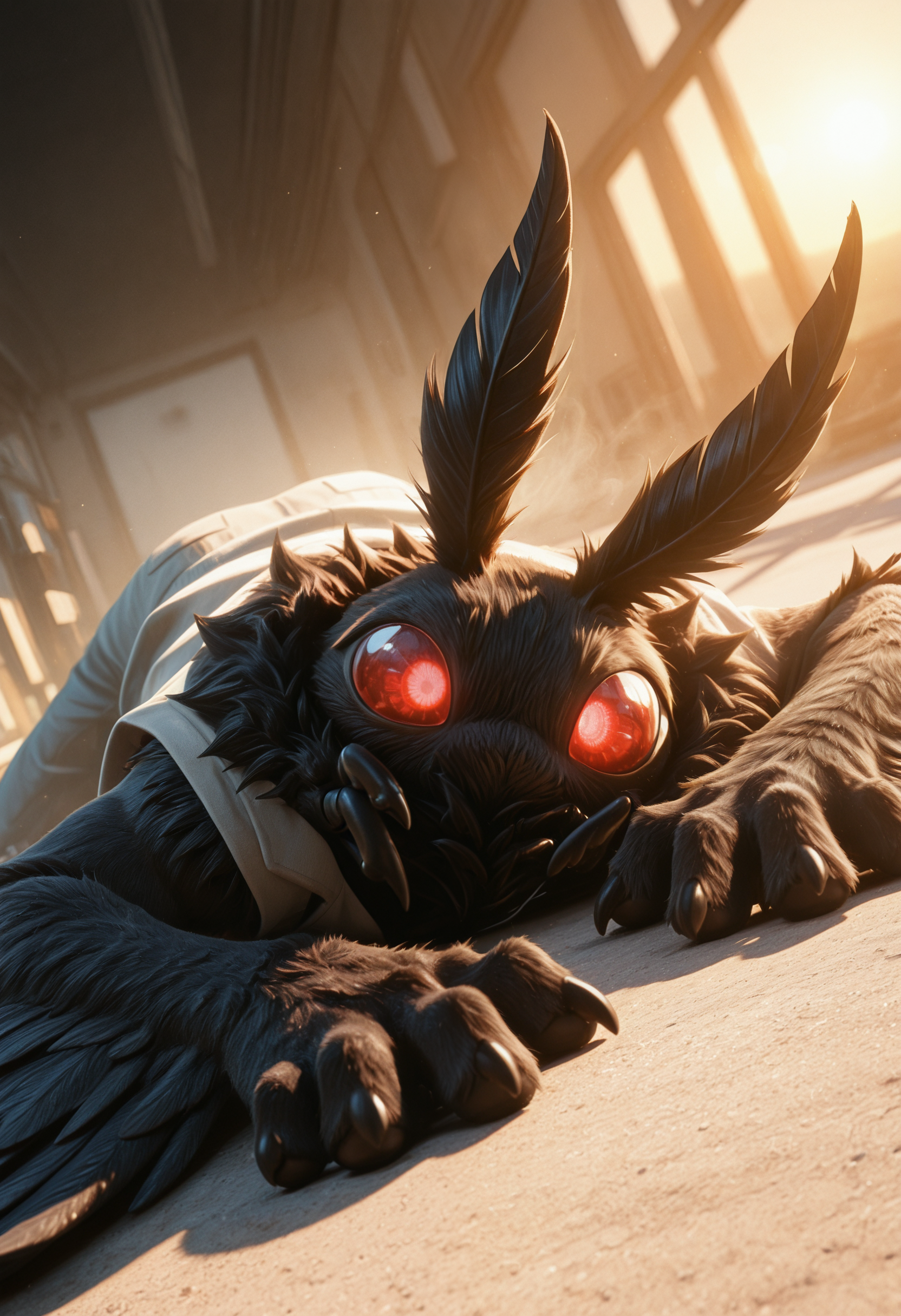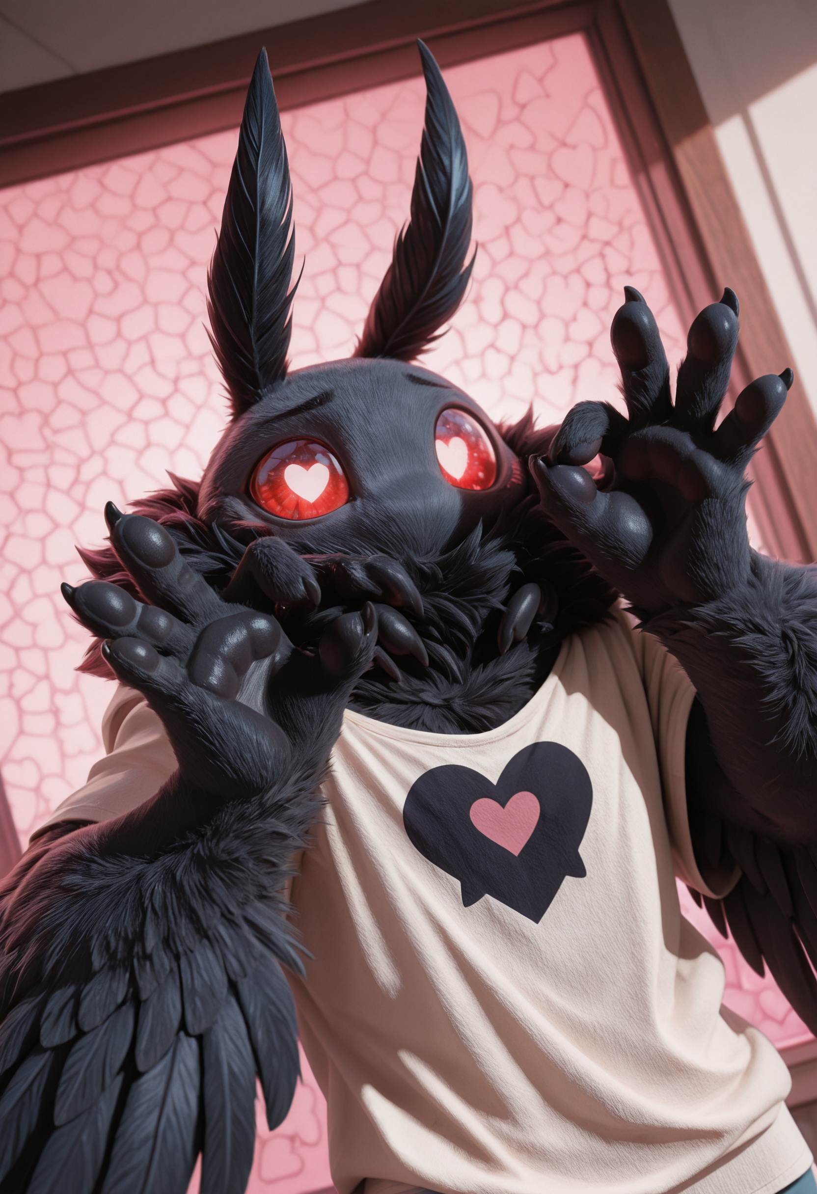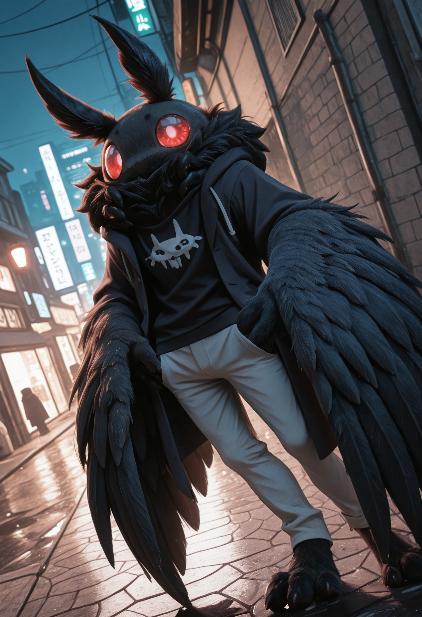 at1as_crypt1d_cru3h, moth, arthropod, furred antennae (anatomy), fur, black fur, body fur, fur, mouthless, anthro, solo, winged arms, male, 1boy, clothing, clothed, neck multi limb, black pawpads, red eyes, glowing eyes, claws