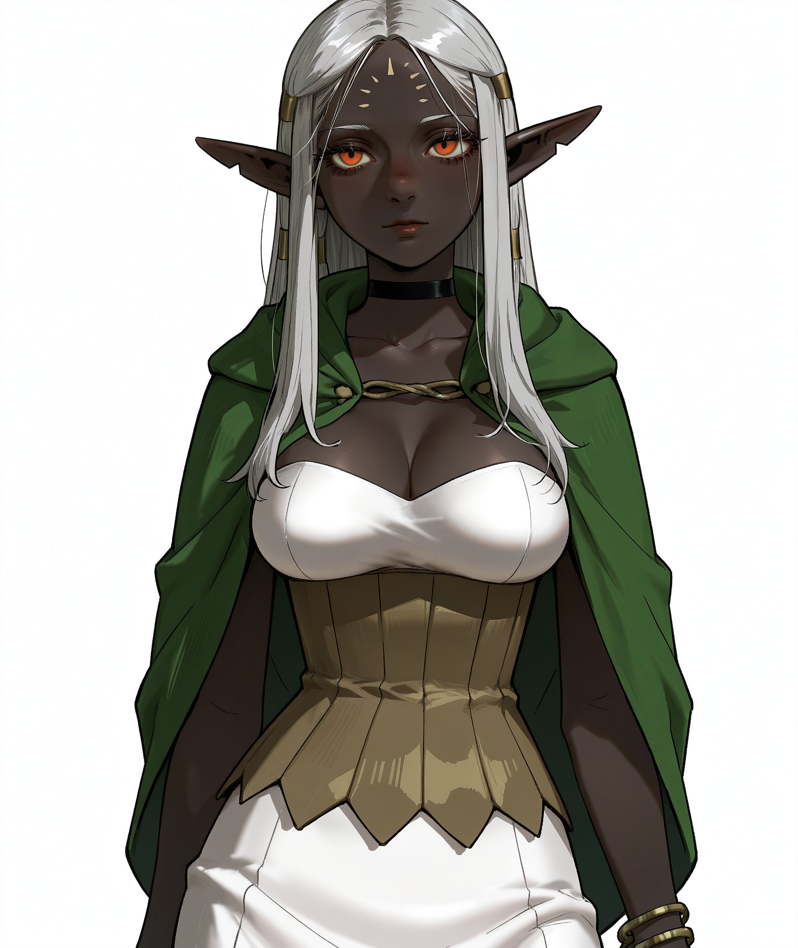 - 가슴, collarbone, 손톱, 드레스, 가슴 사이, 흰 드레스, 망토, 팔찌, 겉옷, 코르셋, 아래가슴, 녹색 망토, 갈색 코르셋, 녹색 겉옷, 여러 개의 반지, 반지, 튜브 탑, 스트랩리스, 후드,
