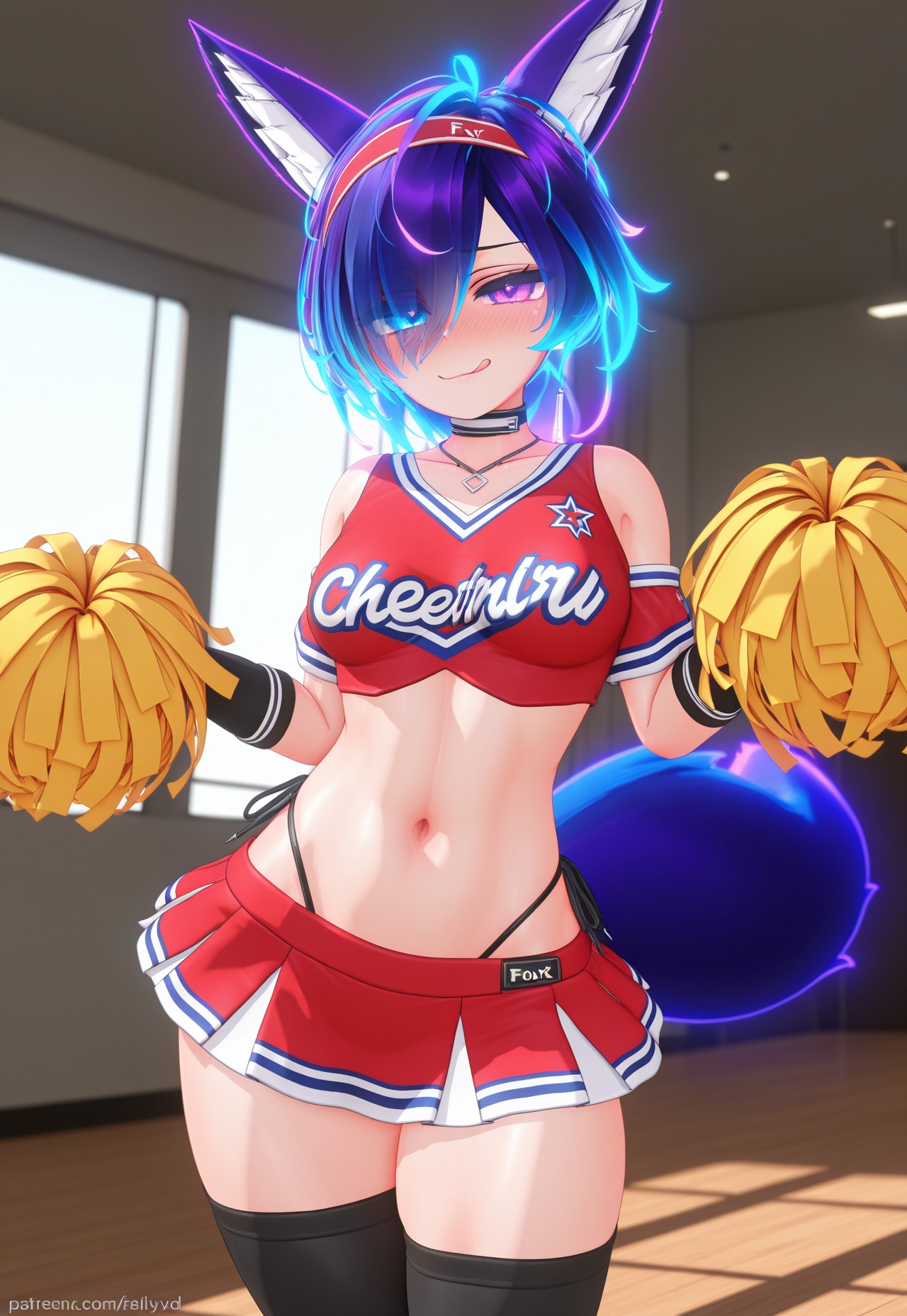 この鮮やかでネオンライトに照らされたアニメキャラクターは、青みがかった紫の髪が光り、虹彩異色の目とキツネのような耳を持ち、白いタンクトップと黒のショートパンツを着用し、背後に大きな光るエネルギーの尾が伸びている。