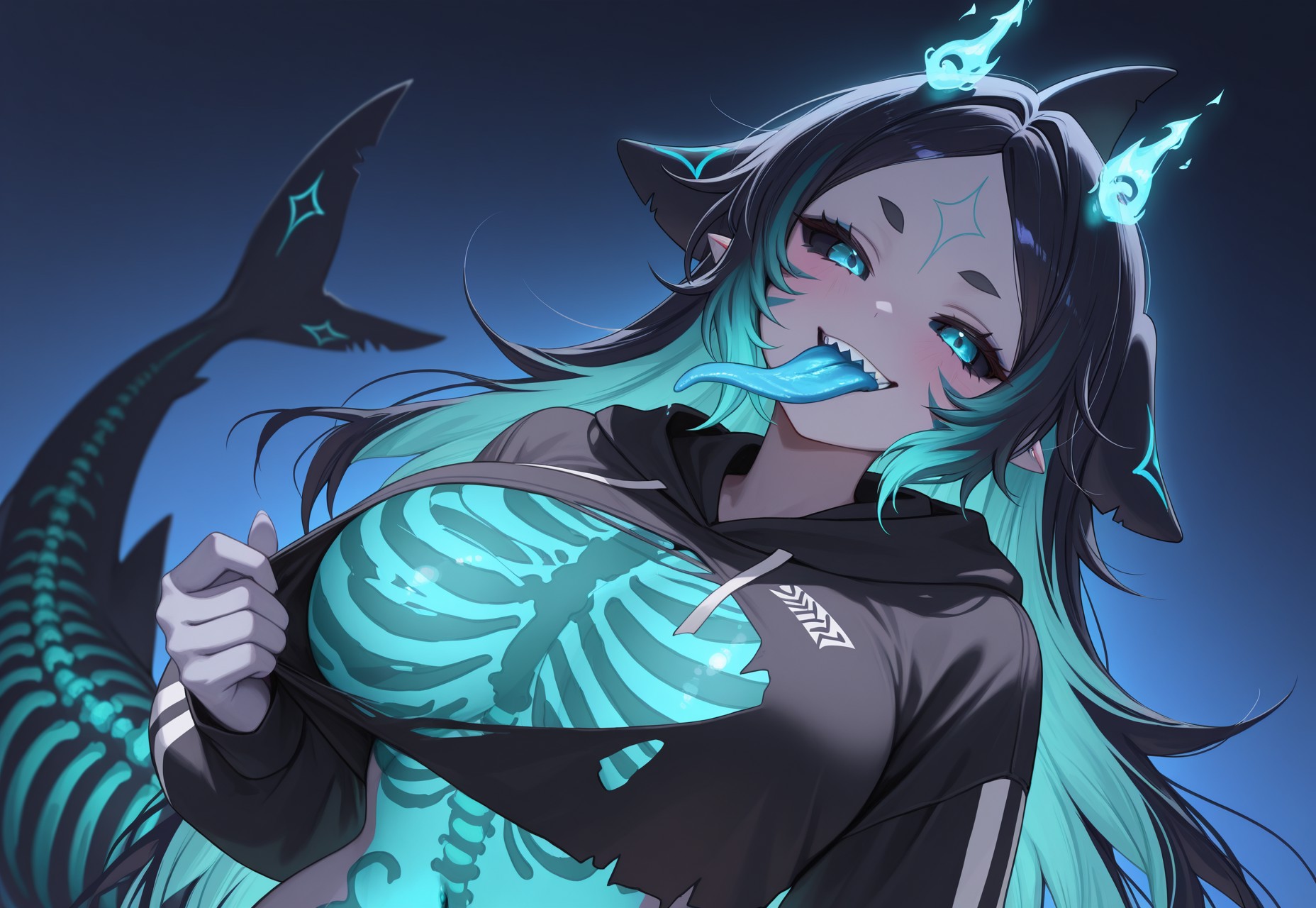このキャラクターは、巨大で輝く骨格の尾と、体全体に広がる生物発光の青い模様を特徴とし、カットソー風のフーディーと色違いのストッキングというエッジーな都会的な服装を纏っています。
