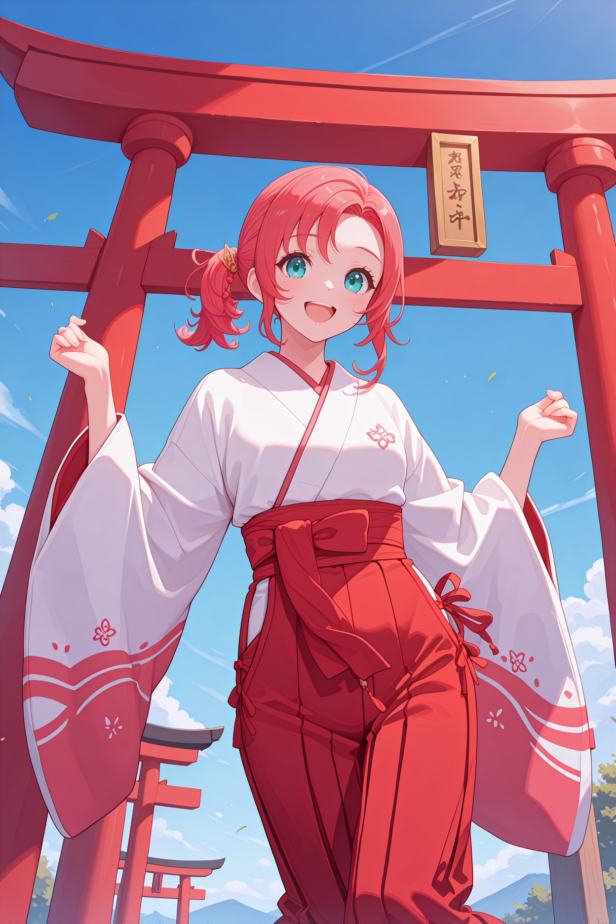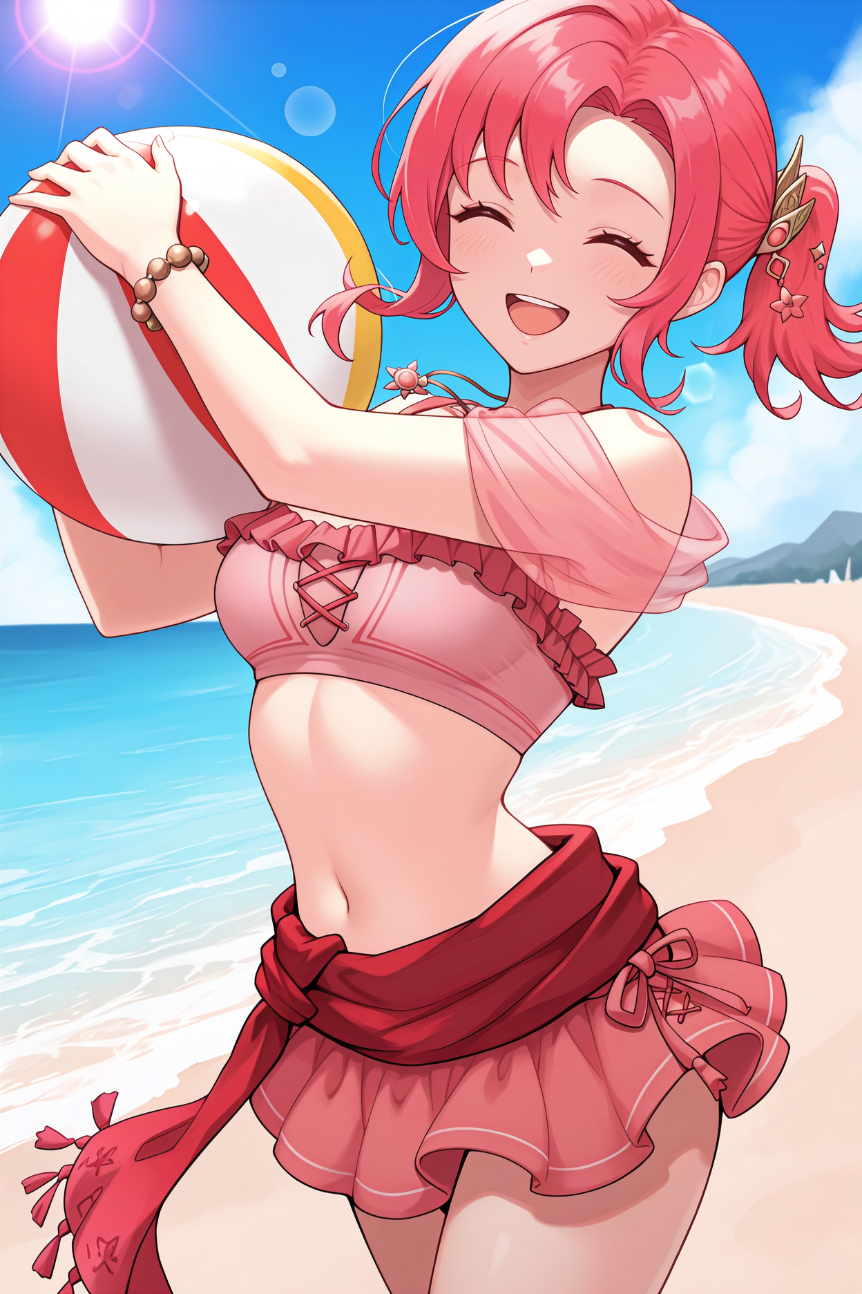 여름 노른을 원할 경우 "smrnre, pink hair, short ponytail, aqua eyes, hair ornament, necklace, pink bikini, frilled bikini, bikini skirt, pink skirt, red sash, bracelet, sandals"를 추가하세요.