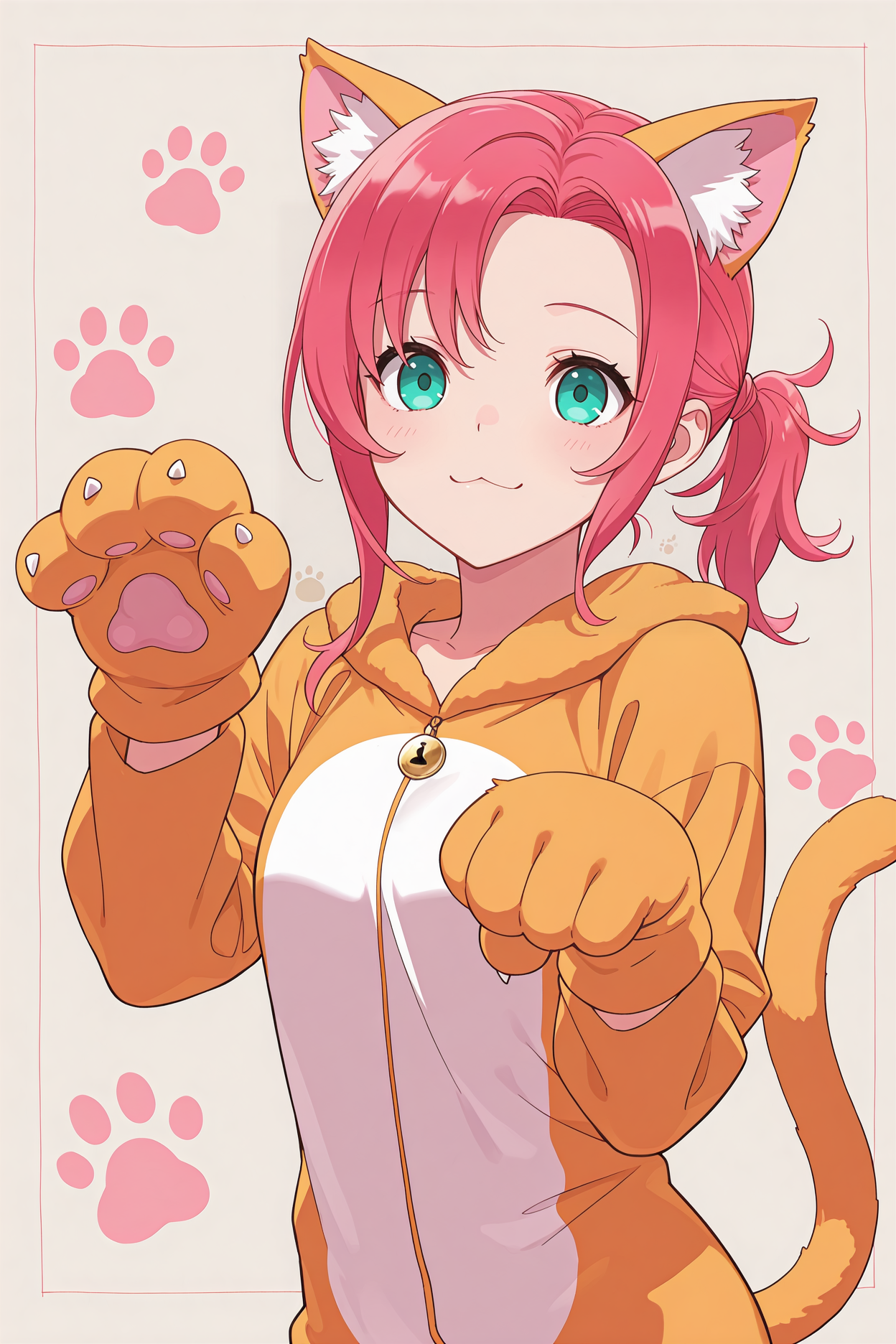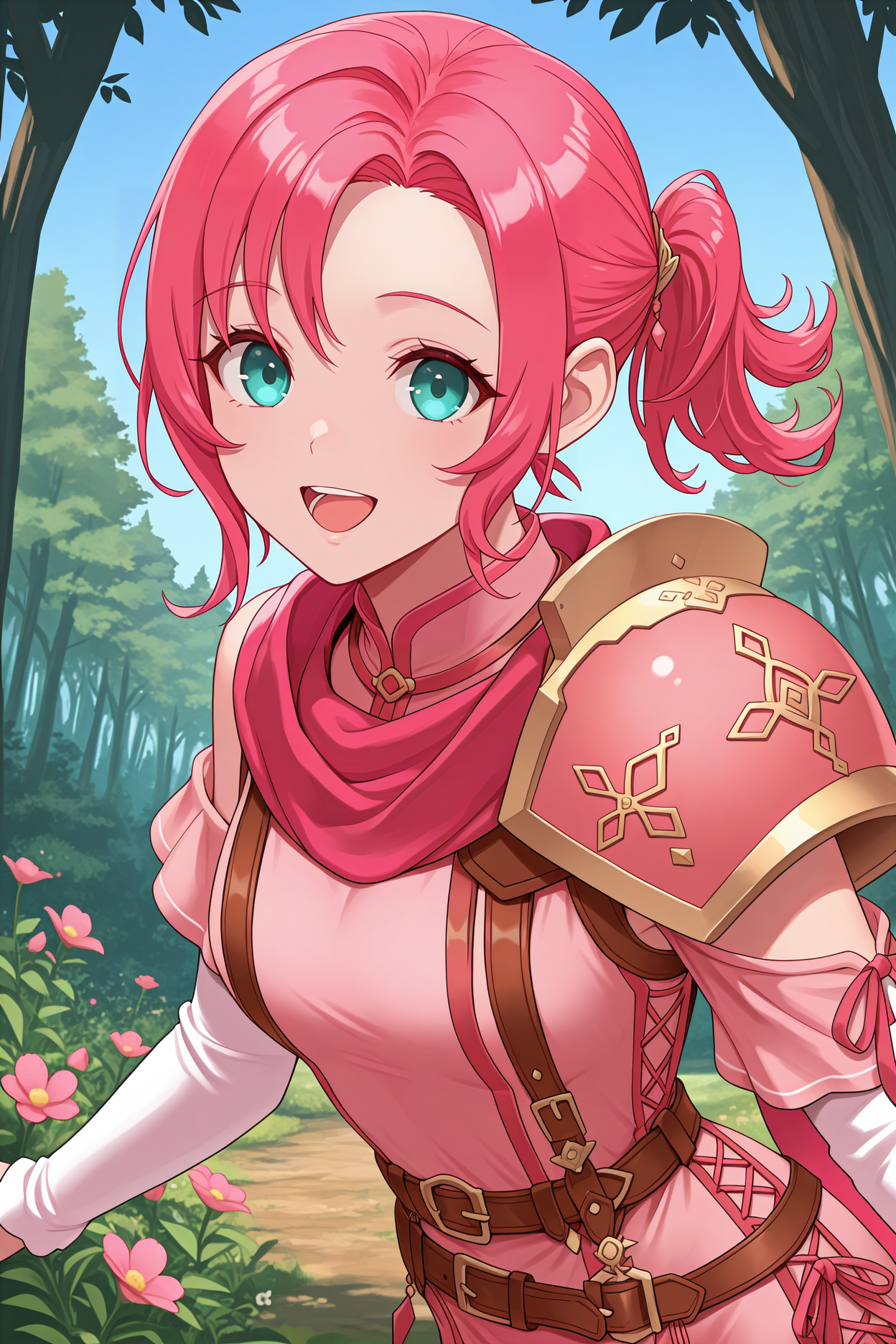 일반 외모를 원할 경우 "defnre, pink hair, short ponytail, aqua eyes, single pauldron, pink pauldron, pink scarf, pink dress, short dress, detached sleeves, white sleeves, brown harness, brown belt, multiple belts, white thighhighs, brown boots, ankle boots"를 추가하세요.