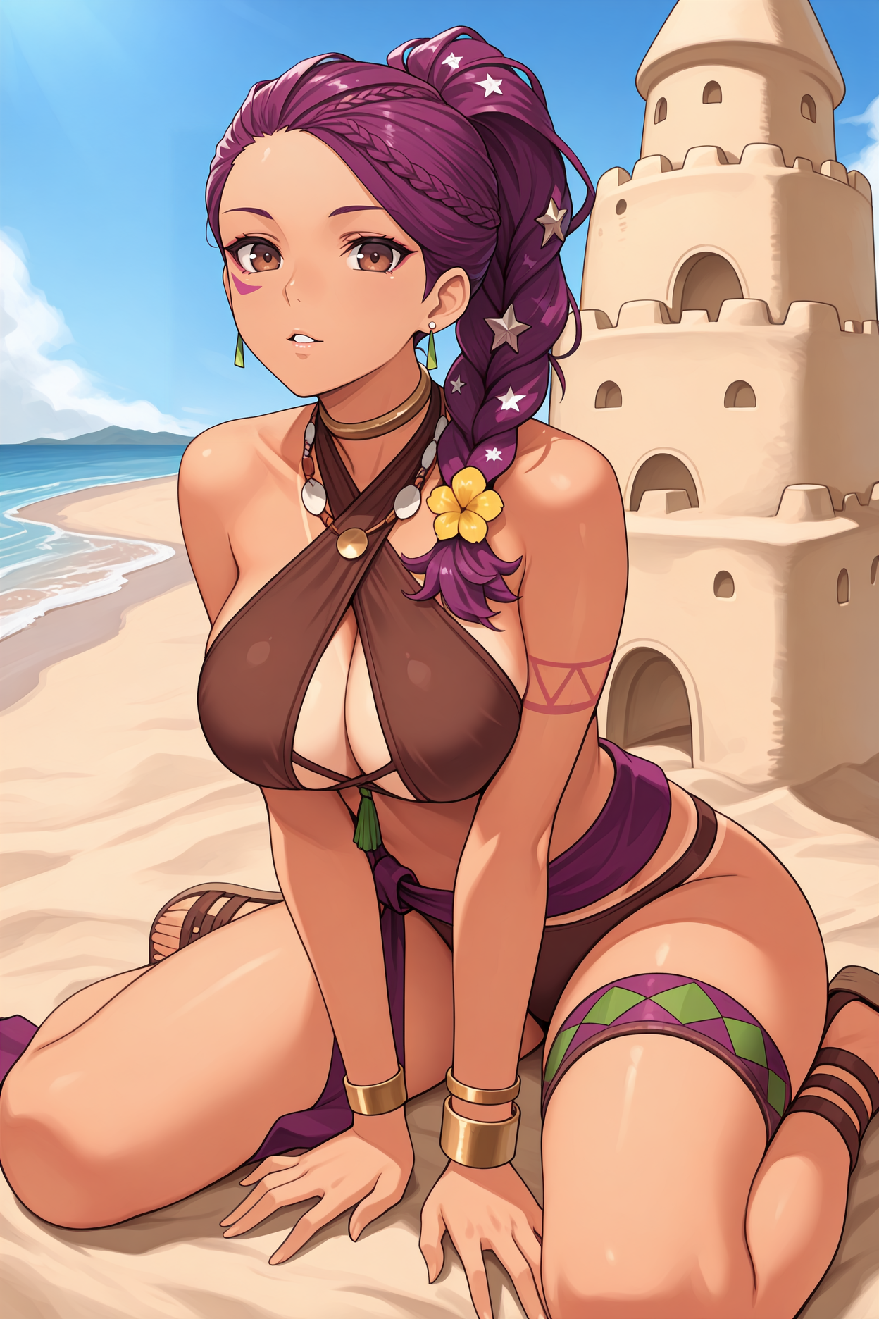 Add "sumpta, tan skin, facial mark, purple hair, braided ponytail, hair pulled back, multiple braids, long hair, brown eyes, star hair ornament, earrings, neck ring, necklace, brown bikini, criss-cross halter, purple sash, gold bracelet, thigh strap, sandals" for Summer Petra.