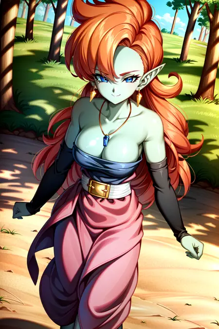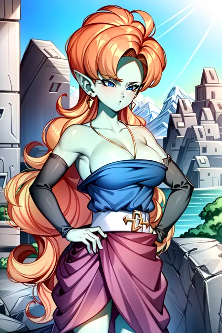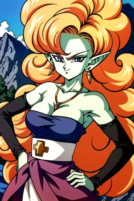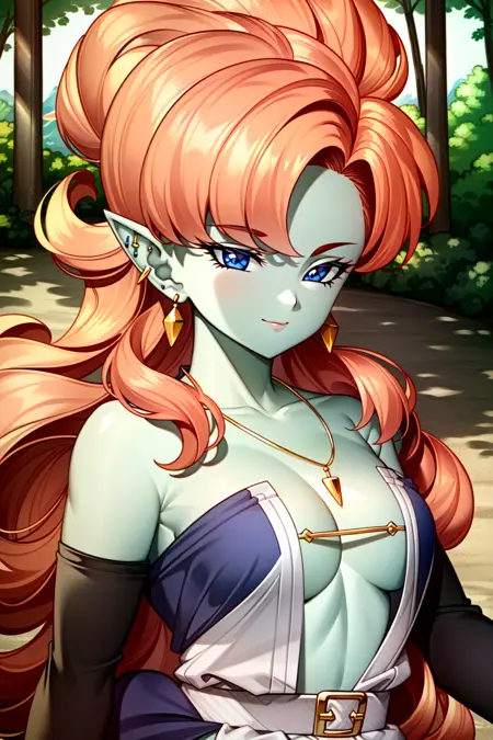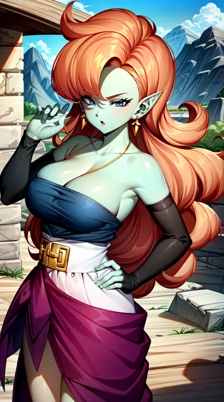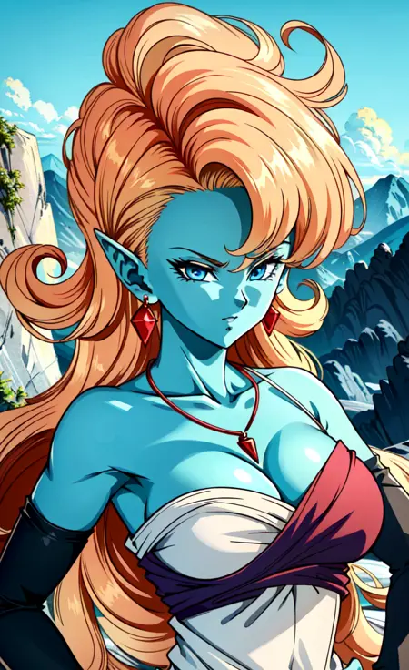 Zangya, 1girl, solo, pointy ears, colored skin, jewelry, earrings, orange hair, blue eyes, blue skin, long hair, gloves, smile, looking at viewer, curly hair