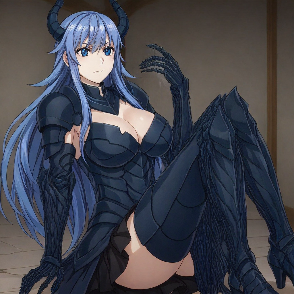 felfi visrotte \(skeleton knight\), dark blue hair, long hair, bangs, sidelocks, blue eyes, dragon horns, armor, armored dress, skirt, gloves, heels, large breasts, 1girl, solo