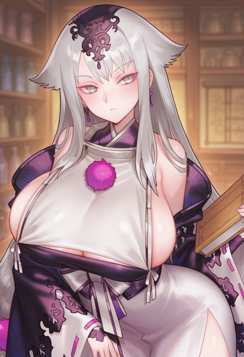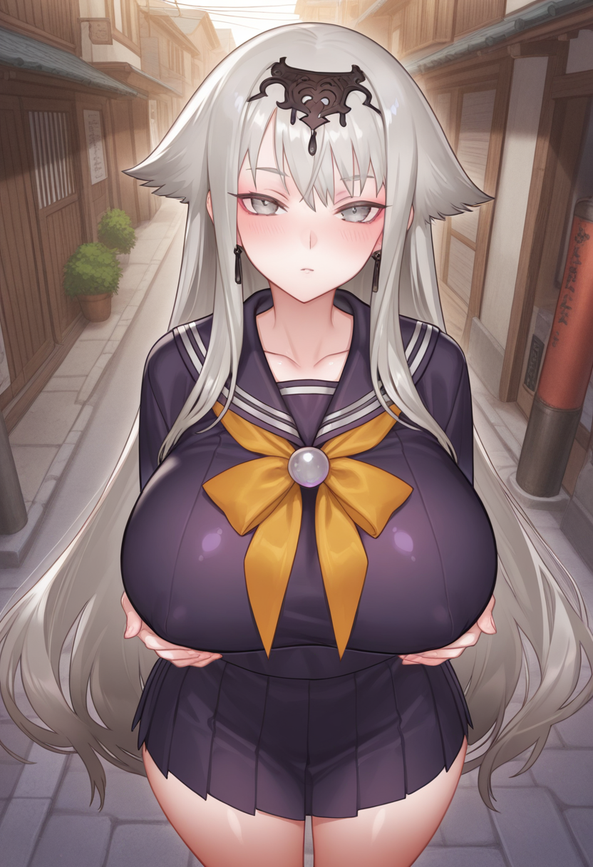 sanki_muramasa, grey hair, long hair, sidelocks, grey eyes, huge breasts