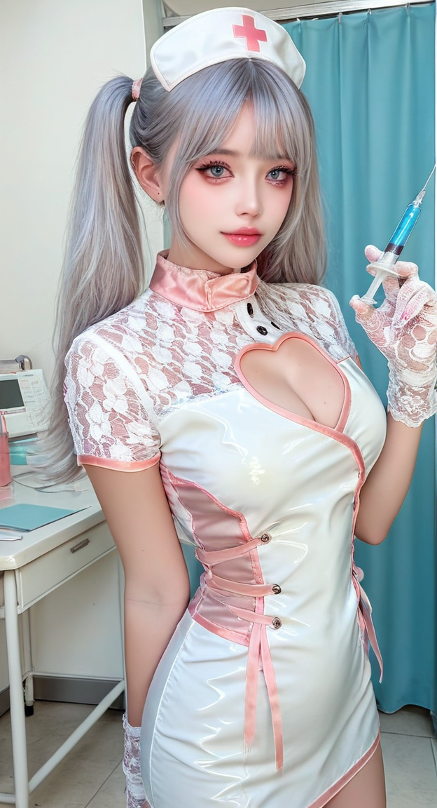 | トレーニングワード | xg1,white gloves, cleavage, nurse, white glossy latex short dress with pink trim, sheer white floral lace sleeves, heart-shaped cutout exposing deep cleavage, pink high collar, black buttons down the front, white lace nurse hat with pink cross and ribbons, white lace gloves, short sleeves, holding a large syringe in one handコピーしました! |