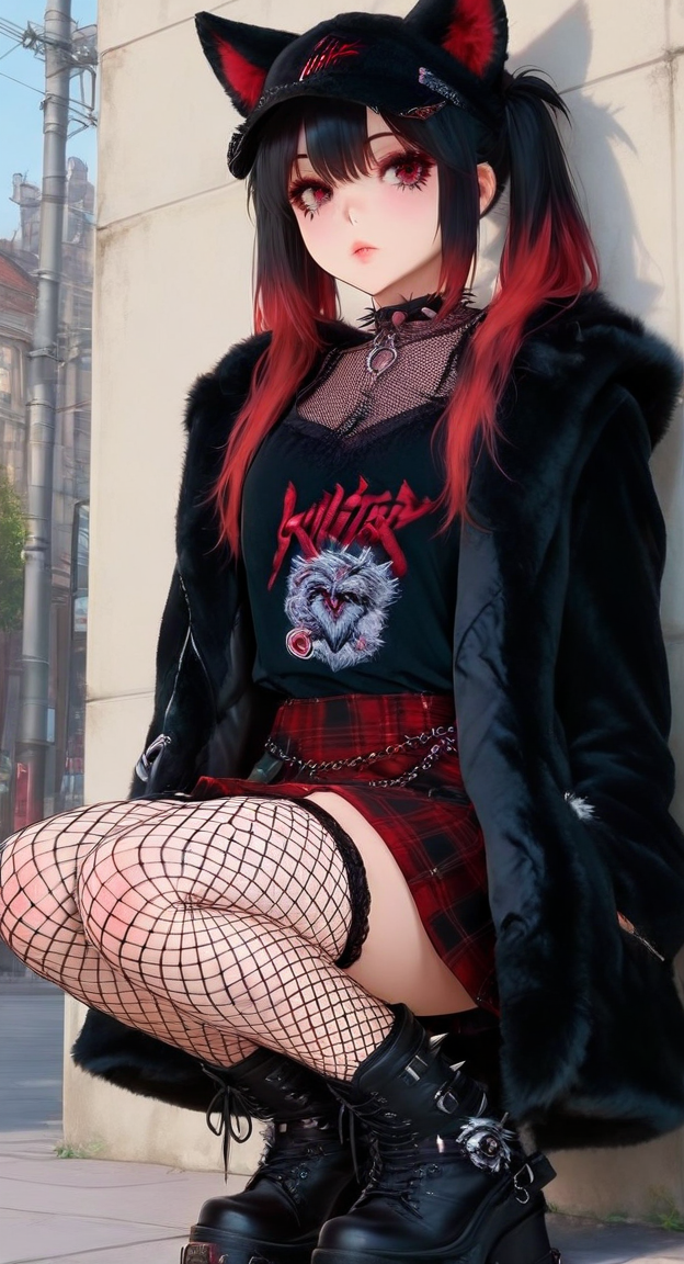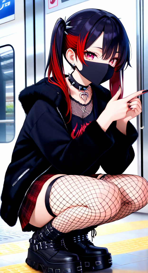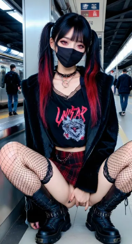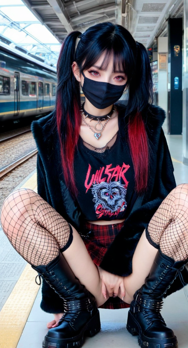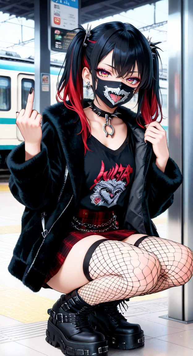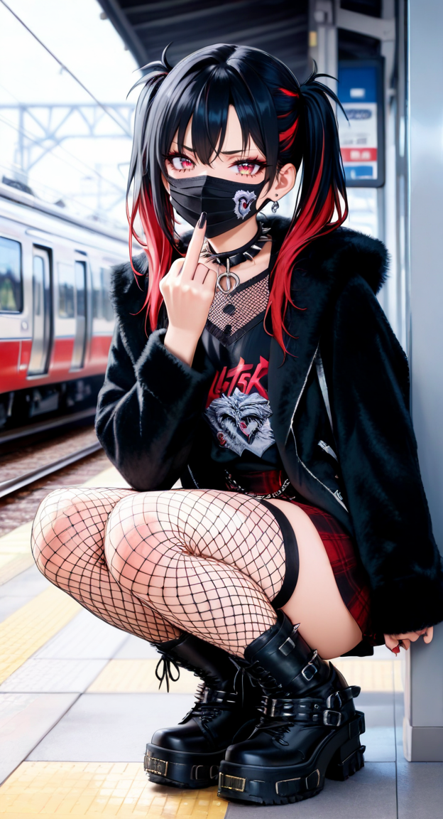 | トレーニングワード | oversized black faux fur jacket open, (wearing a black face mask:1.1), black Killstar band t-shirt, red wolf skull graphic over sheer, black fishnet long sleeve, spiked black choker with chains, red-black plaid mini skirt with wallet chain, black large fishnet stockings, heavy black platform combat boots with straps, xg1コピーしました! |
