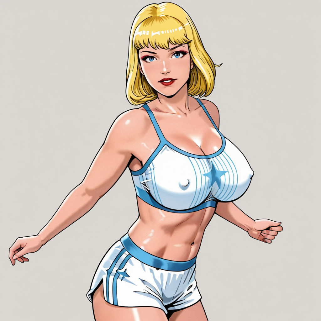 트리거: MissVictory, 1girl, breasts apart, blonde hair, blue gloves, cape, superhero, lipstick, domino mask, makeup, navel, red lips, blue eyes, earrings, center opening, jewelry, large breasts, leotard, cleavage, no bra, collarbone, cowboy shot