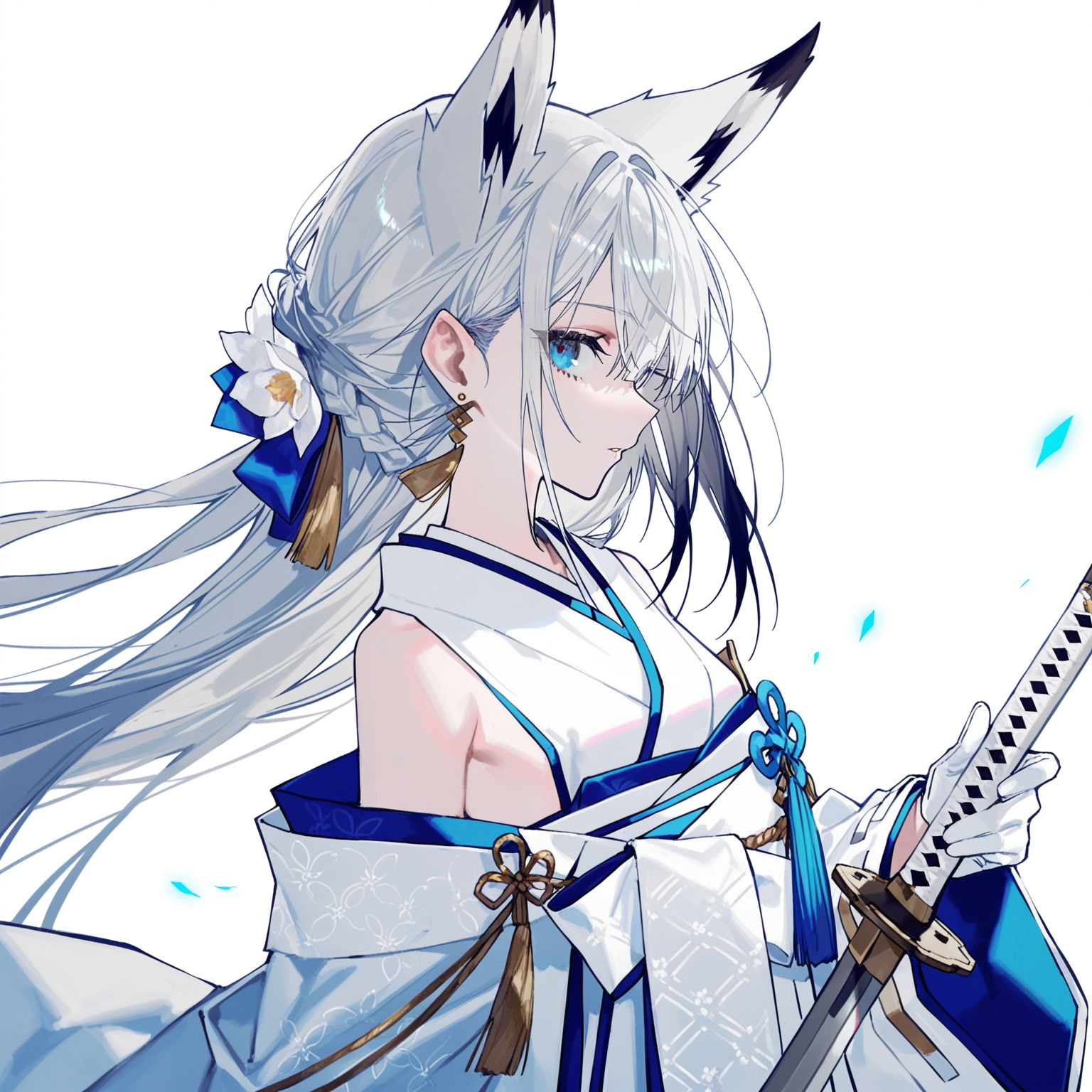 everyday wear, JiangFeng[Azur Lane], 1girl, weapon, long hair, sword, animal ears, holding weapon, thighhighs, transparent background, sailor collar, holding sword, holding, gloves, solo, wide sleeves, black thighhighs, skirt, black skirt, tail, tachi-e, rigging, black sailor collar, zettai ryouiki, neckerchief, fox ears, katana, ribbon-trimmed clothes, ribbon trim, machinery, pleated skirt, turret, ribbon-trimmed sleeves, full body, blue neckerchief, detached sleeves, torpedo launcher, fox tail, miniskirt, standing, no eyes, faceless, faceless female, simple background, white background, kimono, white kimono, sleeveless kimono, japanese kimono, fox girl, collarbone, bow, half gloves, black gloves, rudder footwear
