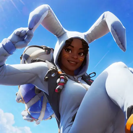 Trigger : bnnybrwlrlna, dark skin, short hair, facial mark, hood, fake animal ears, bodysuit, zipper, ammo strap, grenade, gloves, single knee pad, animal slippers