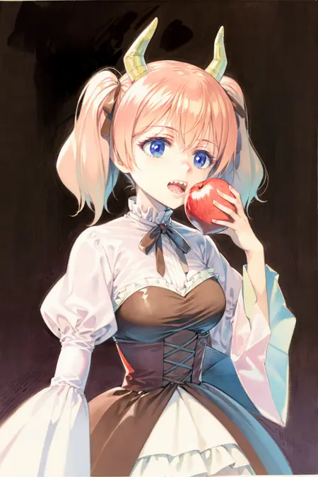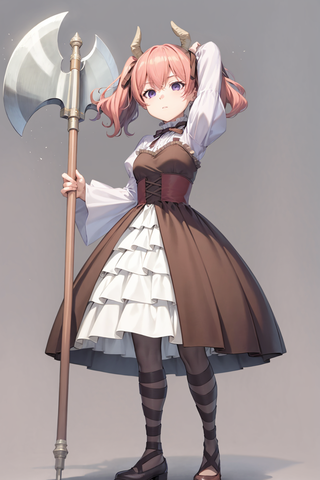 tag:1girl,horns, pink hair,twintails,hair,ribbon,bow,purple eyes,juliet sleeves, long sleeves, brown dress,corset,pantyhose,